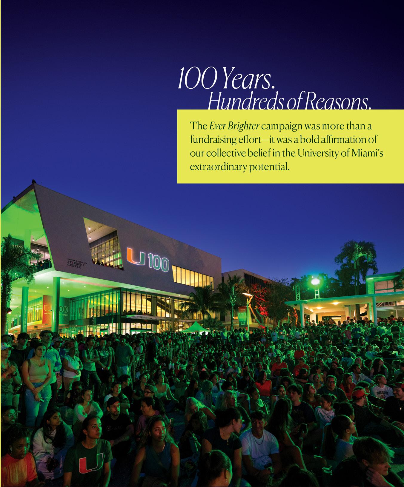 Every great institution is shaped by the people who believe in its future. Ever Brighter: The Campaign for our Next Century proved just how deeply our alumni, families, and friends believe in the University of Miami—and the extraordinary impact that belief can have. As we close this historic chapter on our most ambitious and successful campaign, raising nearly $2.7 billion, we do so with deep gratitude and renewed energy.