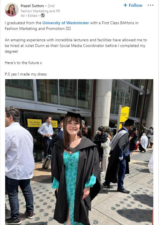 It’s been a wild journey so far filled with unforgettable memories and lifechanging opportunities. I am looking forward to final year and joining all these Graduates in the fashion world.