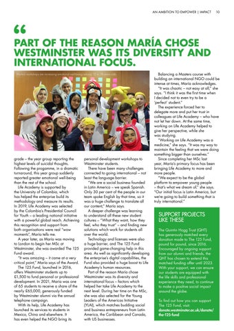 grade – the year group reporting the highest levels of suicidal thoughts. Following the progamme, in a dramatic turnaround, this year group suddenly reported greater emotional well-being than the rest of the school. Life Academy is supported by the University of Colombia, which has helped the enterprise build its methodology and measure its results. In 2019, Life Academy was selected by the Colombia’s Presidential Council for Youth – a leading national initiative with a powerful global reach. Achieving this recognition and support from both organisations were real “wow moments”, María tells me. A year later, as María was moving to London to begin her MSc at Westminster, she was awarded The 125 Fund award. “It was amazing – it came at a very critical point,” María says of the Award. The 125 Fund, launched in 2016, offers Westminster students up to £1,500 to fund personal or professional development. In 2021, María was one of 65 students to receive a share of the nearly £65,000, generously funded by Westminster alumni via the annual telephone campaign. With its help, Life Academy has launched its services to students in Mexico, China and elsewhere. It has even helped the NGO bring its