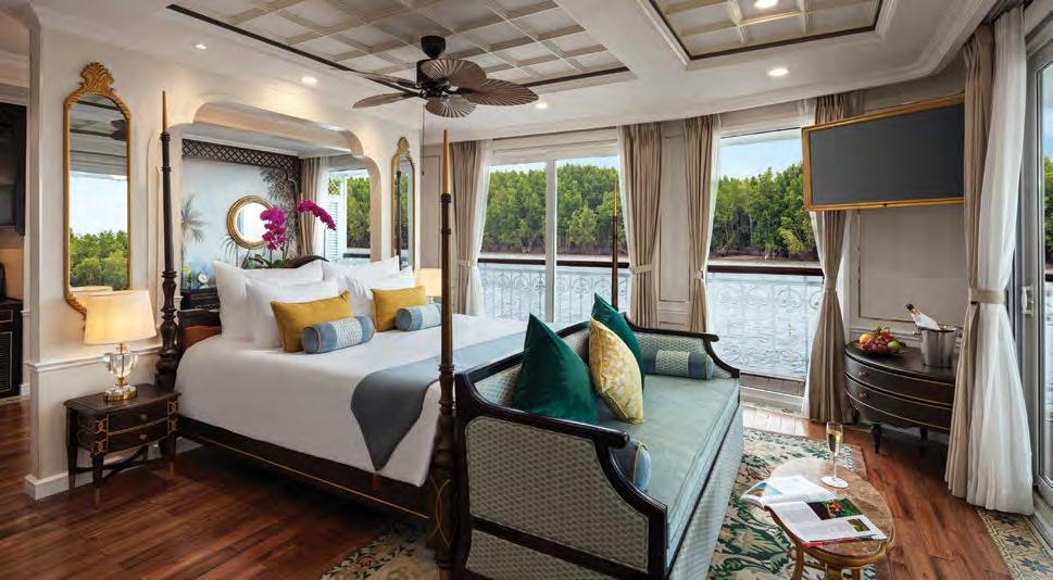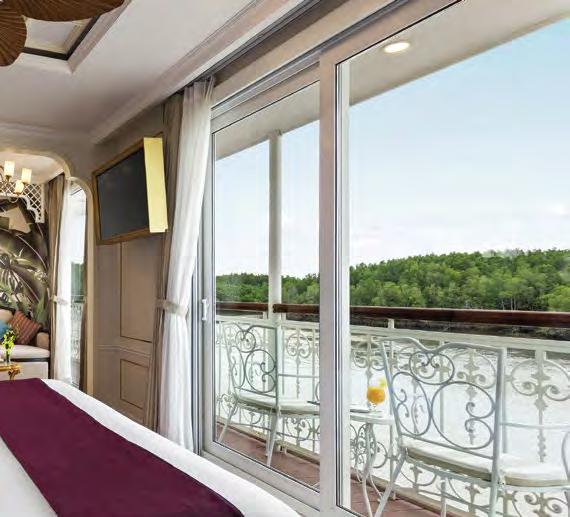 The ship’s spacious, high-ceilinged suites are a serene sanctuary, with beautiful hand-painted murals and all the comforts of a five-star hotel. All suites have a cozy sitting area and a French balcony with floor-to-ceiling glass doors. A bed dressed in soft linens, with a choice of pillows. Your roomy bathroom has a rain shower, comfy robes and slippers, and spa-quality bath products.