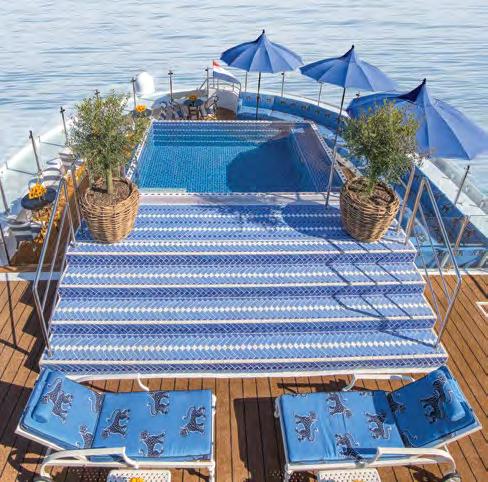 The S.S. Bon Voyage is designed to seamlessly immerse guests in the culture, art, and wine of France. A stunning lobby clad in polished wood, subtle brass details, and a hand-crafted balustrade lend uncommon elegance, while the stylish sun deck boasts the river cruise industry’s first and only infinity pool. An onboard bar lounge, Le Salon Champagne, is resplendent in chic emerald tones with a design inspired by Yves Saint Laurent’s personal abode, Villa Majorelle. In addition to the public spaces, the S.S. Bon Voyage features four spacious suites, and every stateroom features an exquisite marble bathroom.