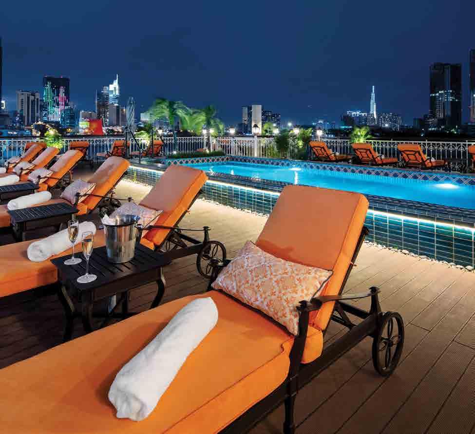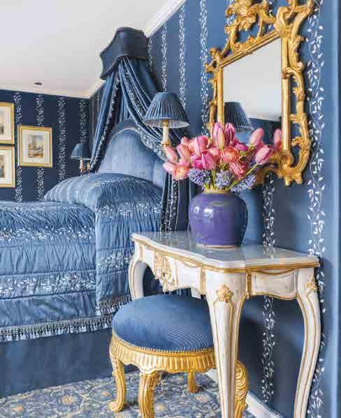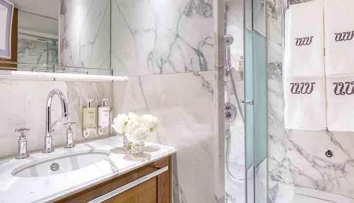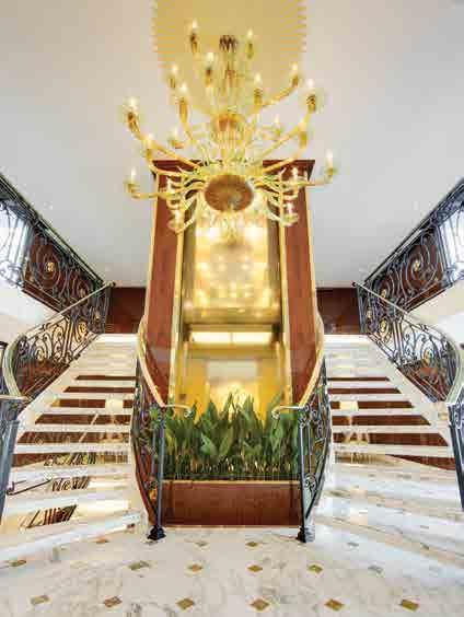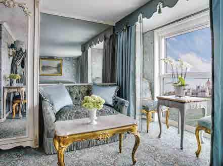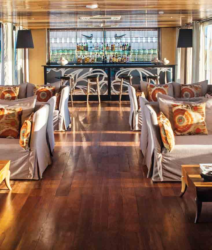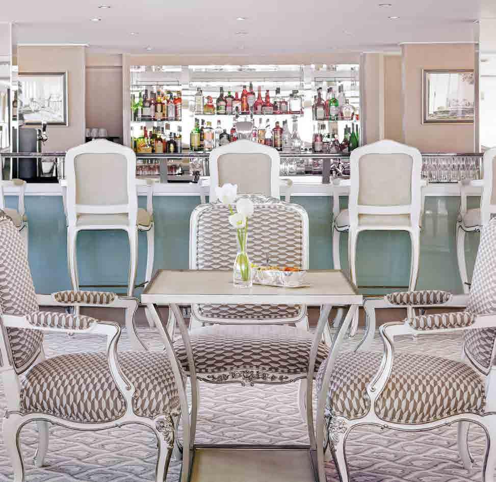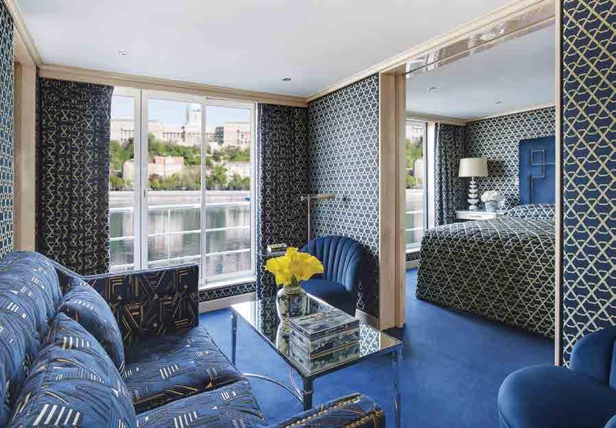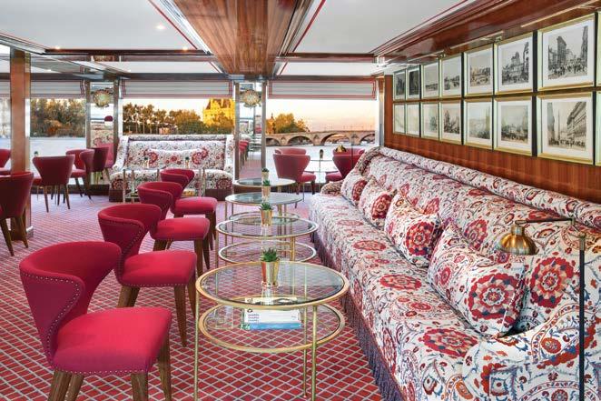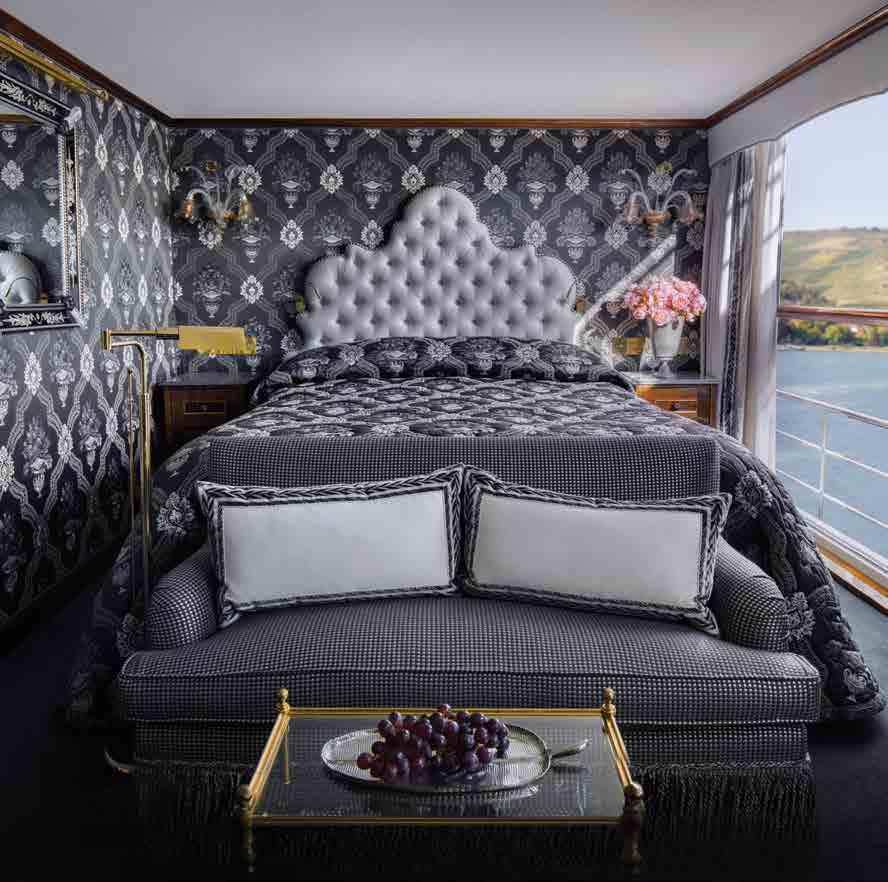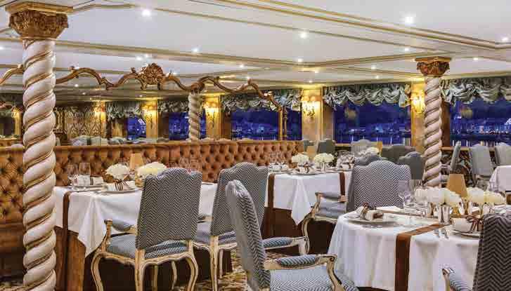 The luxurious décor of the 443-foot, 152-passenger S.S. Antoinette —Uniworld’s first Super Ship—features fine Brazilian marble on the walls and floors, a 19th-century Venetian glass mirror, a stylish Bar du Leopard with full-service bar, and an onboard cinema. The two-story foyer boasts a 3 metre blue Strauss Bacca rat chandelier with huge sapphires—a stunning piece that once hung in New York’s famous Tavern on the Green—and a collec tion of original artwork is displayed throughout the ship.