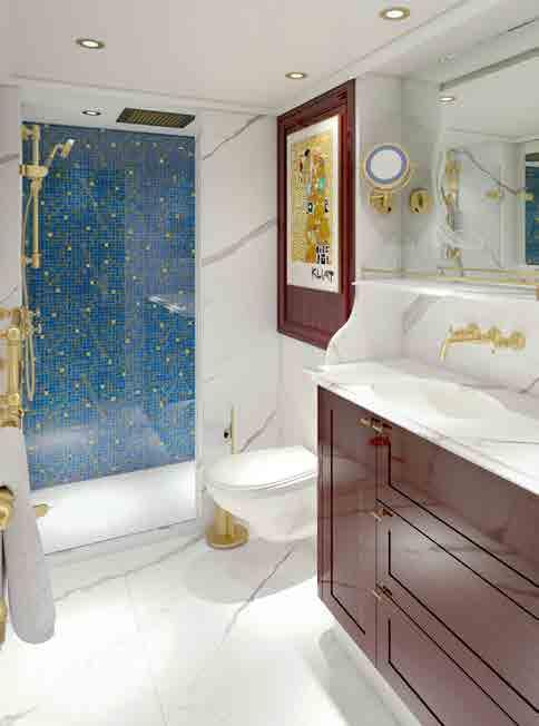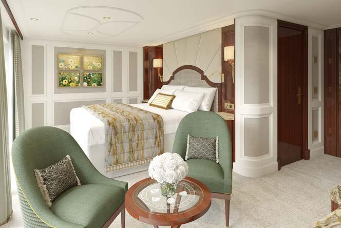 The ship’s spacious, high-ceilinged suites are a serene sanctuary, with beautiful hand-painted murals and all the comforts of a five-star hotel. All suites have a cosy sitting area and a French balcony with floor-to-ceiling glass doors. A bed dressed in soft linens, with a choice of pillows. Your roomy bathroom has a rain shower, comfy robes and slippers, and spa-quality bath products.