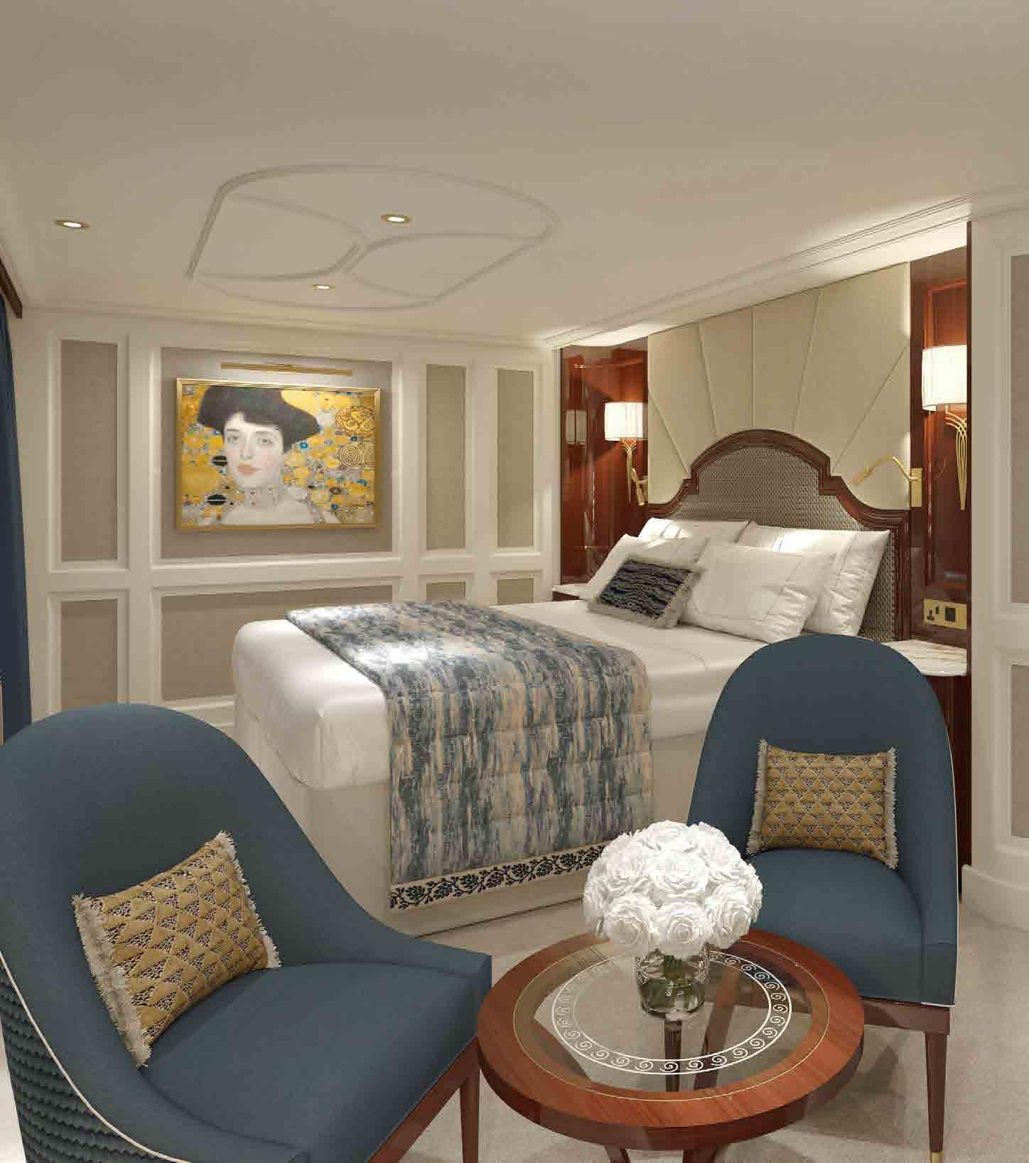 Sailing the Danube River, the next member of our Super Ship fleet will be inspired by master Viennese painter Gustav Klimt. In his honour, we’re naming the vessel after his beloved muse, Emilie Flöge. When she debuts in 2026, the S.S. Emilie will bring elements of Klimt’s signature style to our guests, with dramatic hues, Art Nouveau elements, and stunning pops of gold. Guests who book a Grand Suite and the adjoining Deluxe French Balcony next door can see their stateroom transformed into an incredibly spacious 2-bedroom suite.