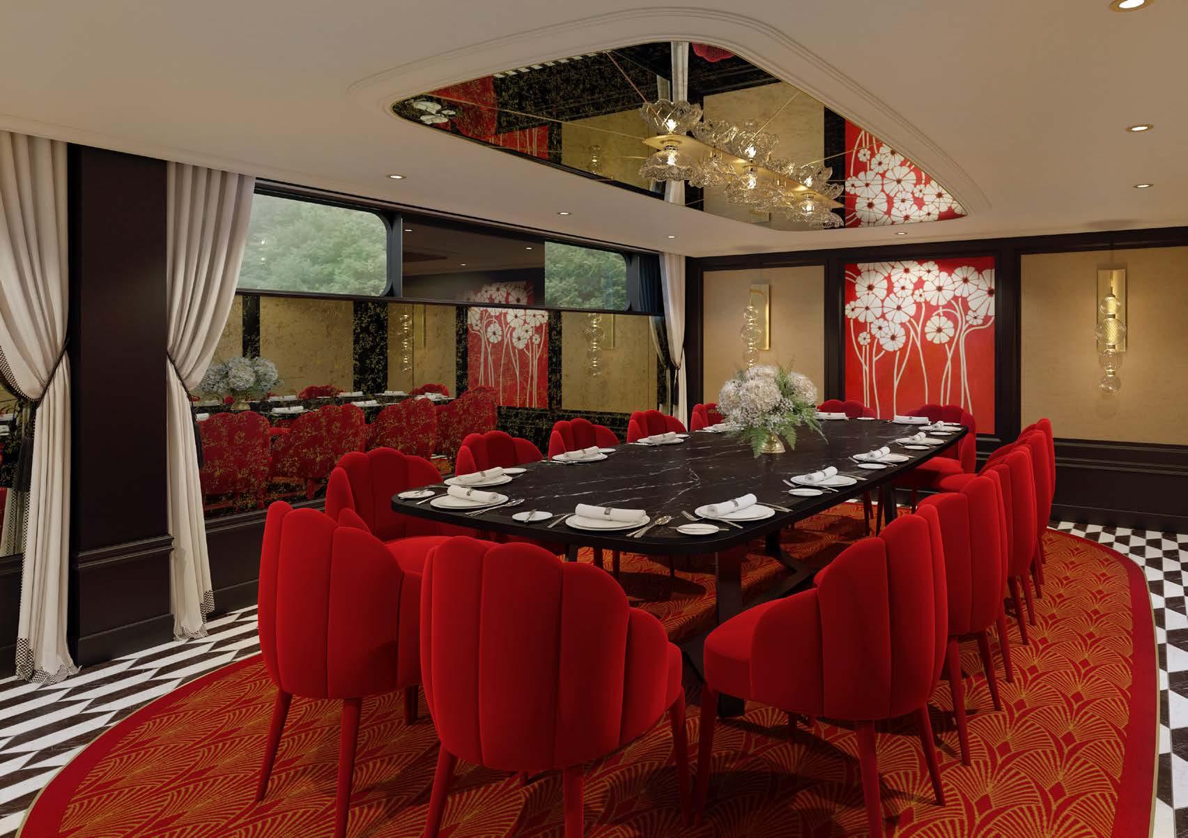 The interior of the S.S. Emilie is primarily crafted from stunning high-gloss walnut veneer, accented with solid decorative frames and exquisite details. Additional materials include marble floors and tabletops, oak herringbone parquet, glass mosaic walls, bevelled mirrors with sandblasted decorations, plush custommade carpets, silk curtains, stained glass doors, and luxurious upholstery in mohair and velvet. As a cherry on top, the artworks in the public spaces are specially created for this project by talented artists.