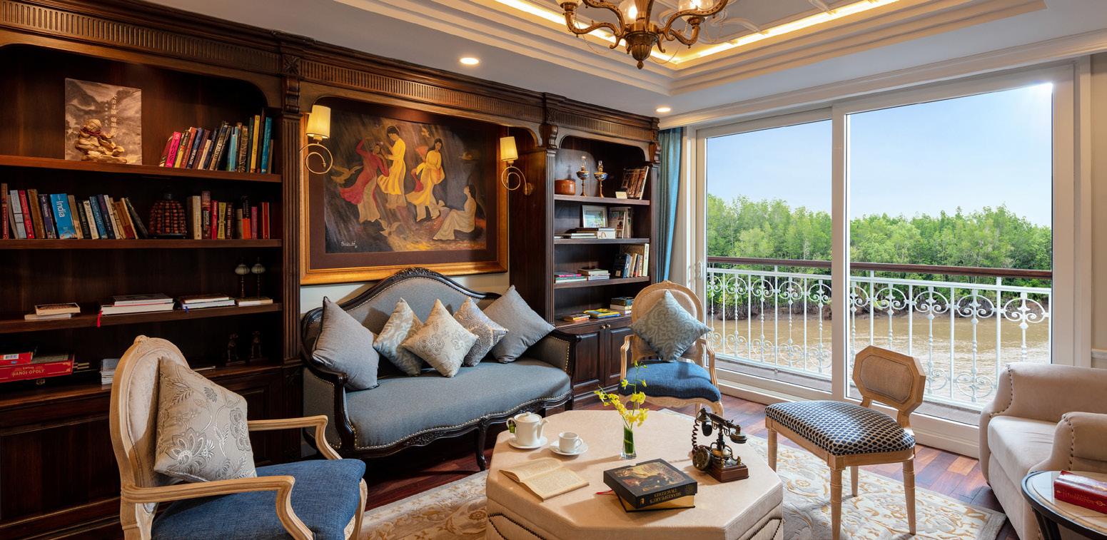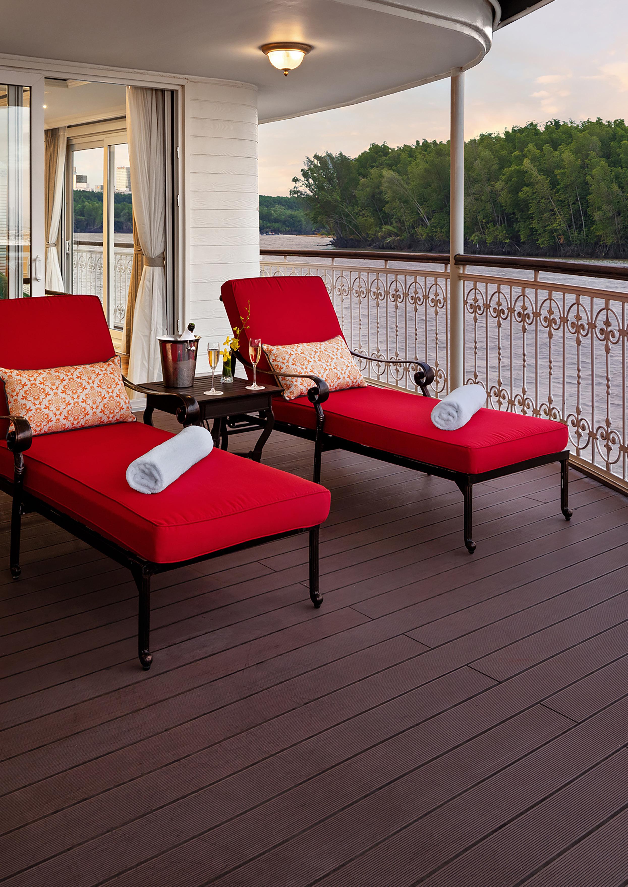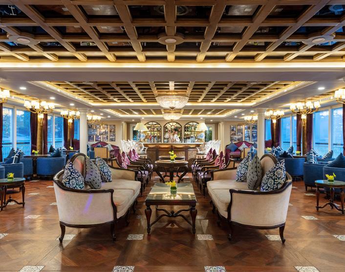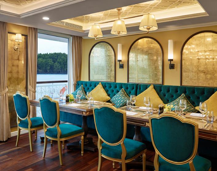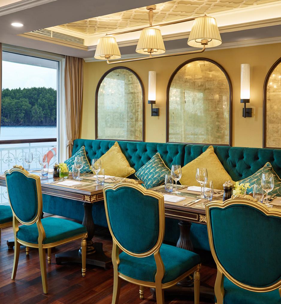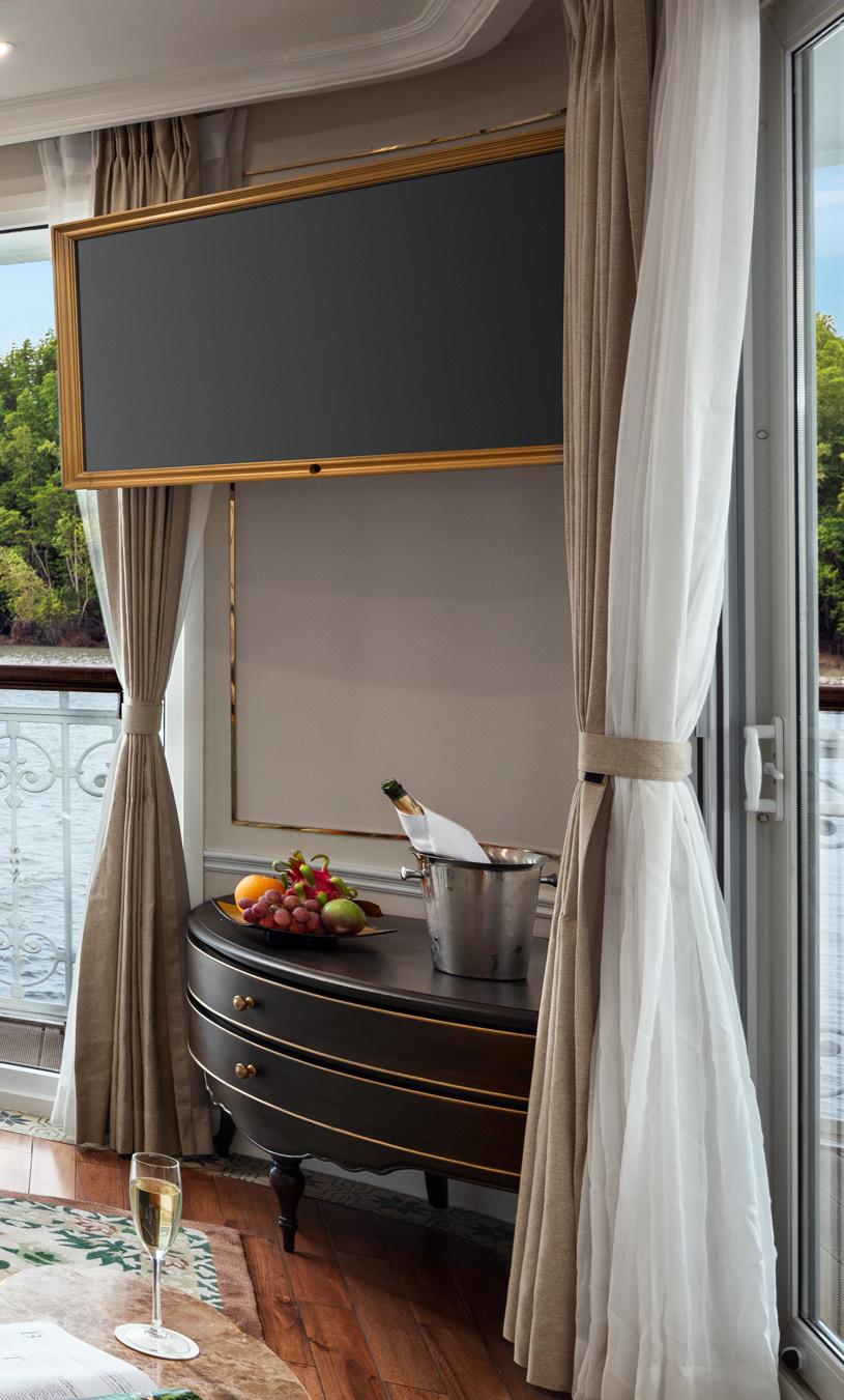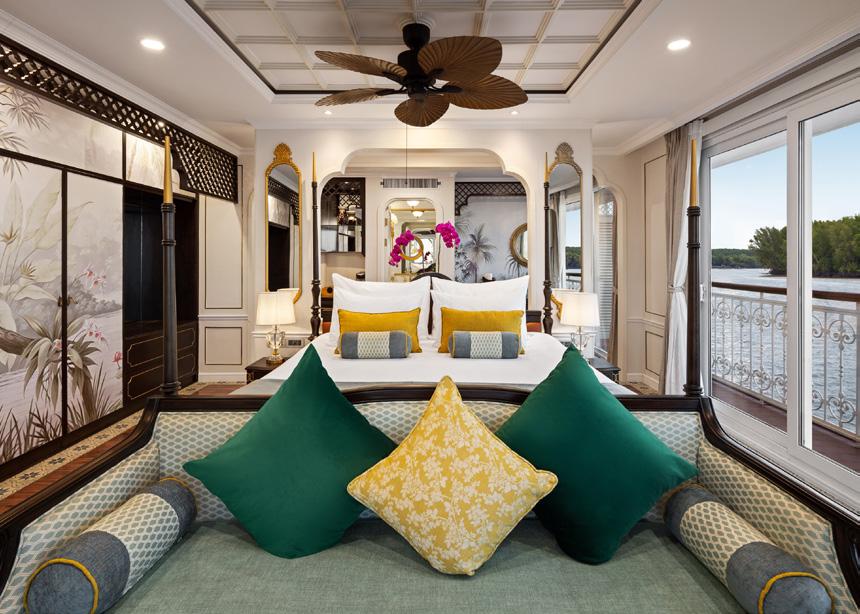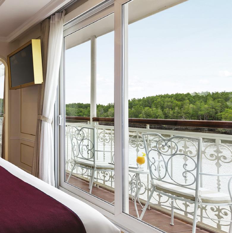 The ship’s spacious, high-ceilinged suites are a serene sanctuary, with beautiful hand-painted murals and all the comforts of a five-star hotel. All suites have a cosy sitting area and a French balcony with floor-to-ceiling glass doors.