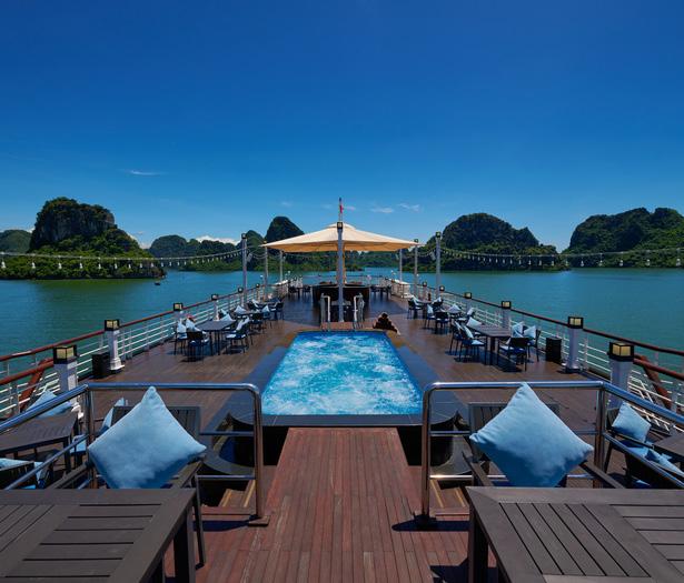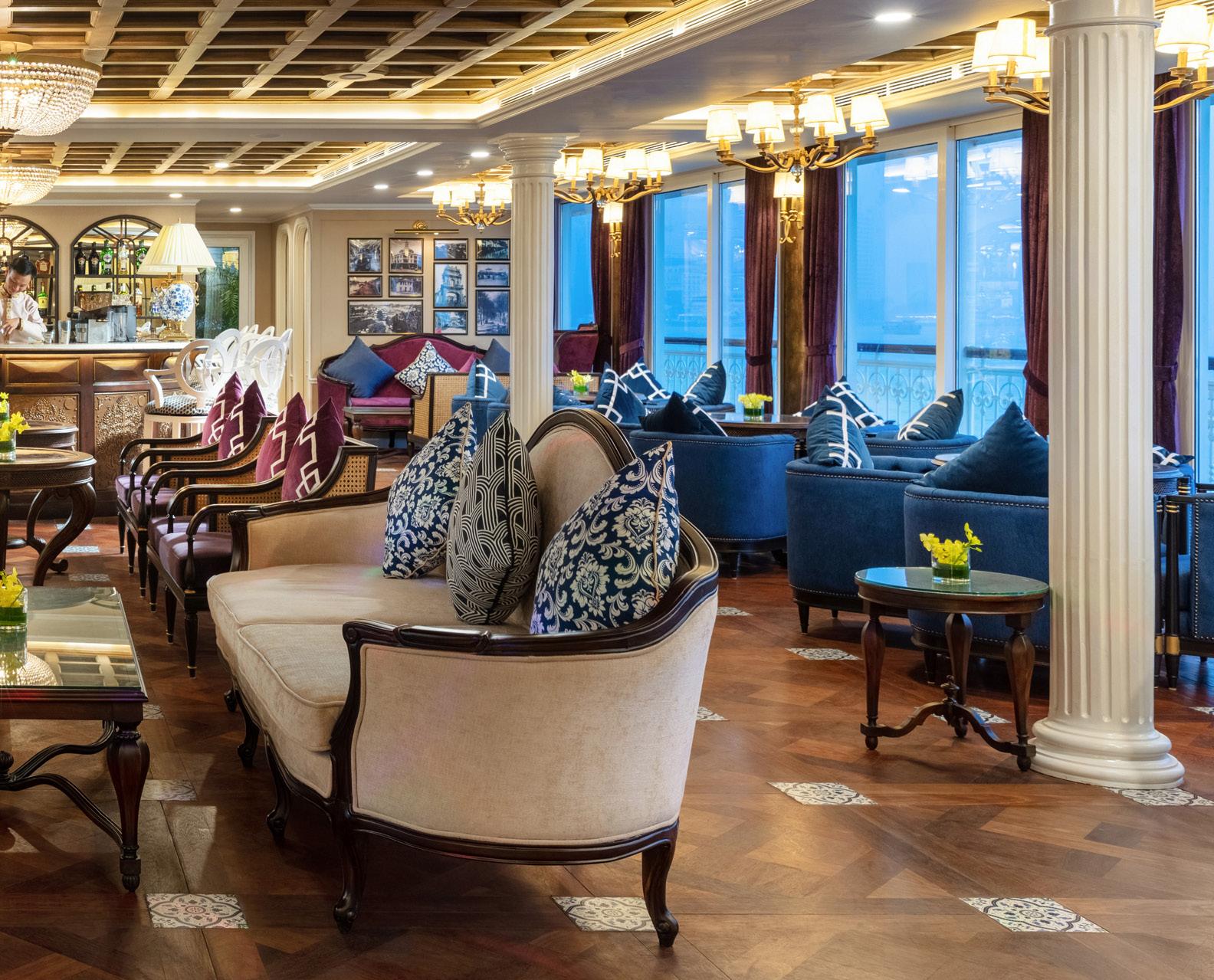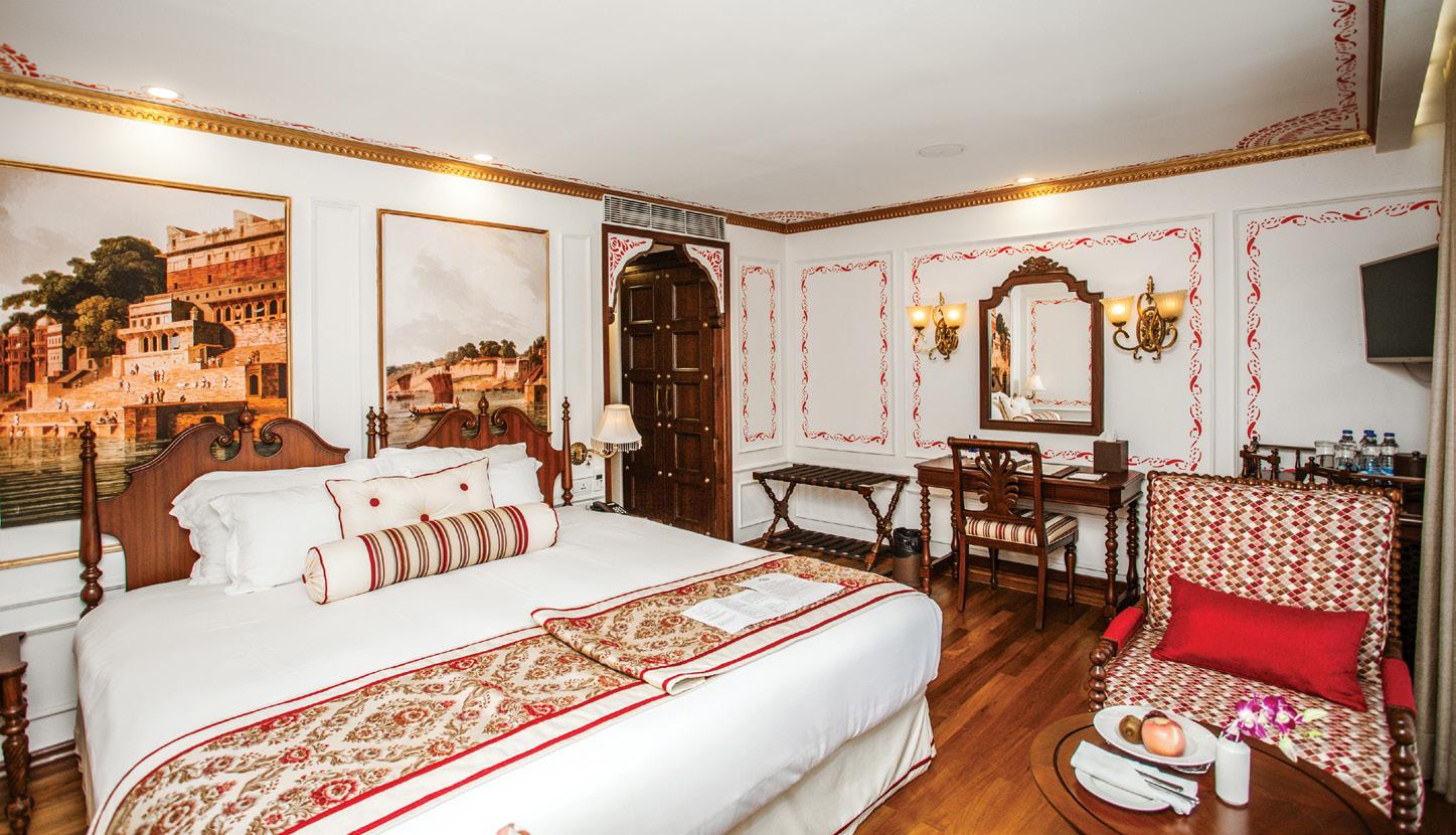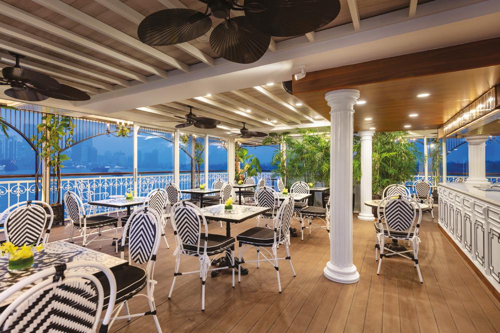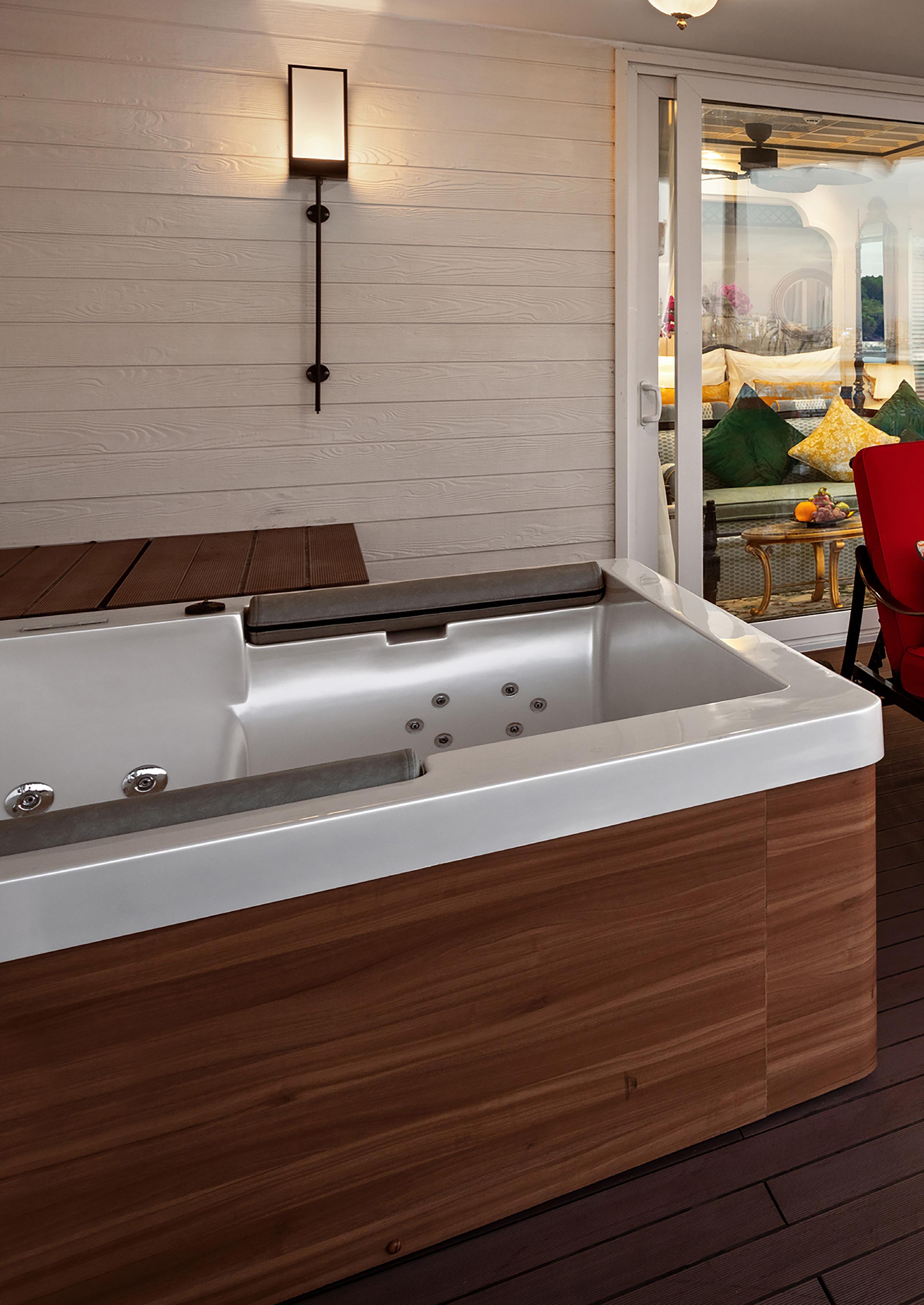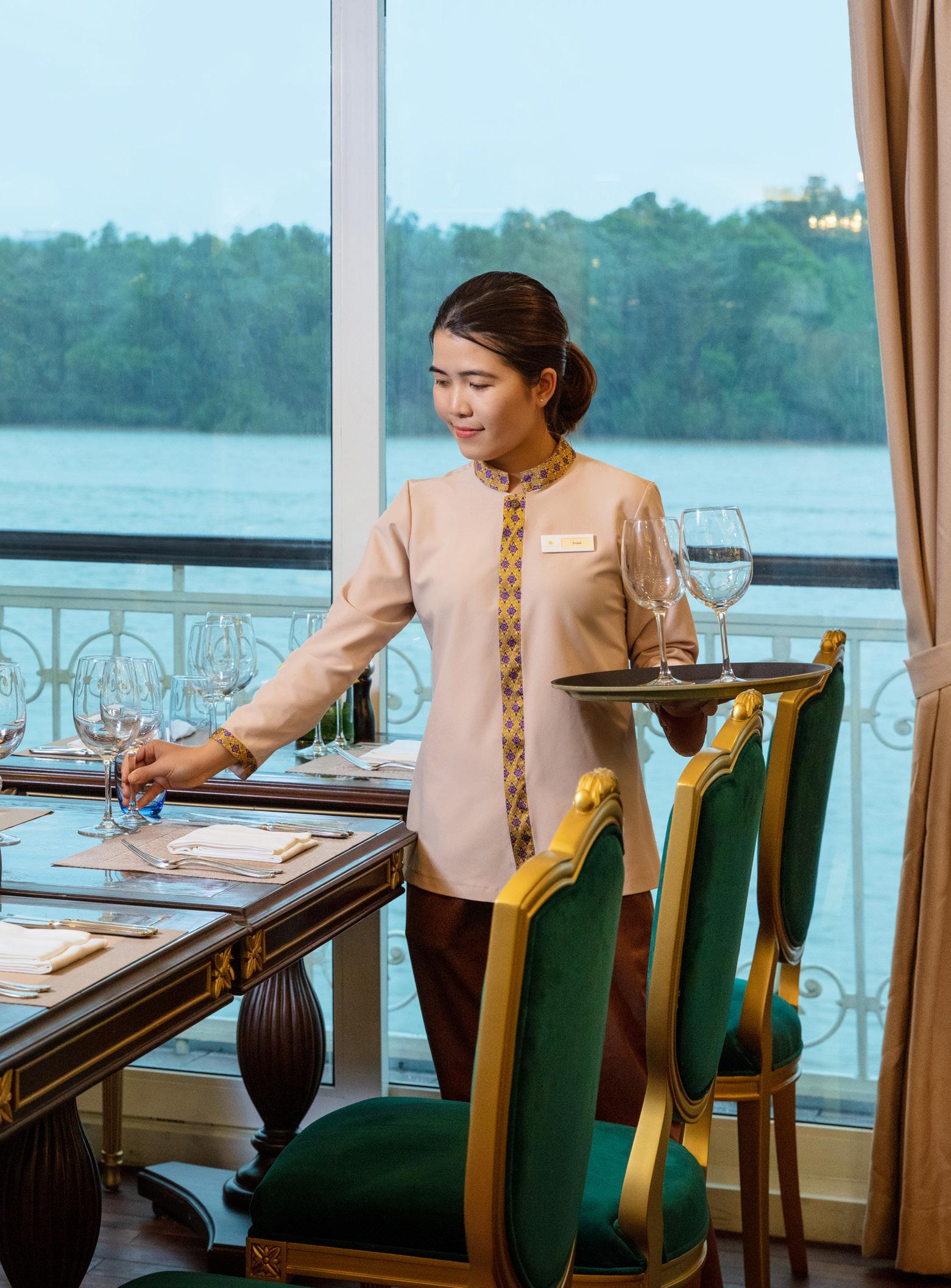 The ship’s spacious, high-ceilinged suites are a serene sanctuary, with beautiful hand-painted murals and all the comforts of a five-star hotel. All suites have a cosy sitting area and a French balcony with floor-to-ceiling glass doors.