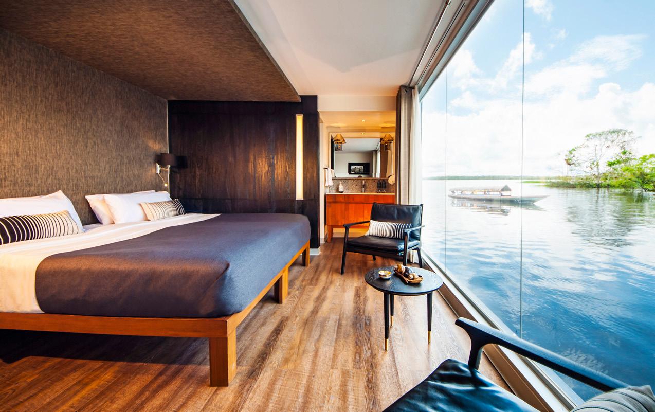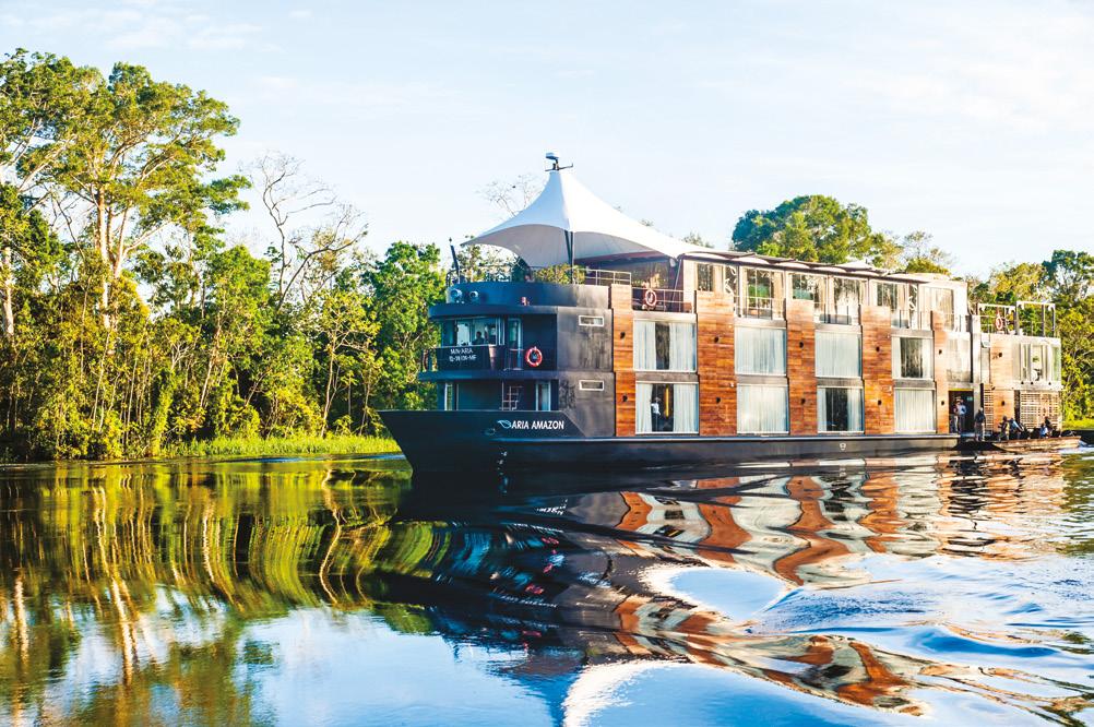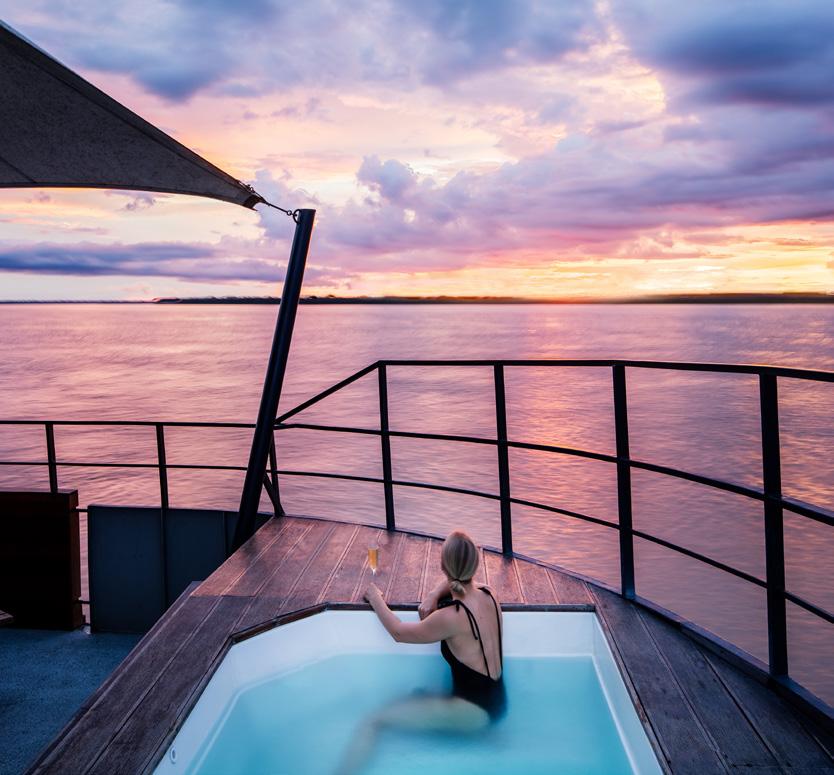 Designed to explore the heart of the Peruvian Amazon in luxury and comfort, the Aria Amazon is an all-suite ship with floor-to-ceiling windows, giving you a full view of the majestic rivers and rainforest. The top deck features a jacuzzi, indoor lounge & bar and an outdoor observation deck.
