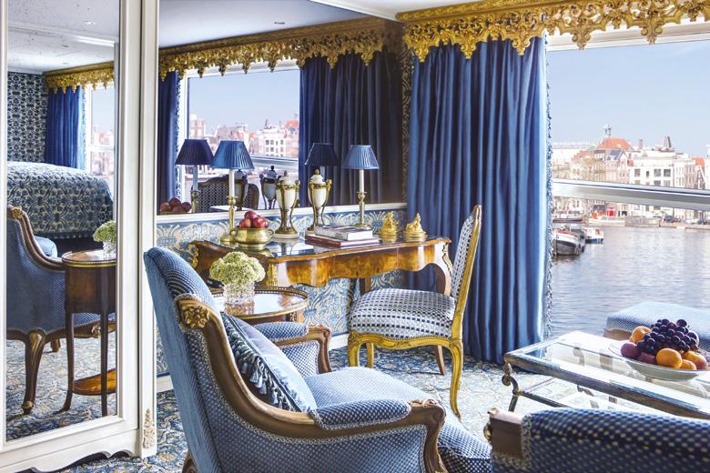 The ship’s spacious, high-ceilinged suites are a serene sanctuary, with beautiful hand-painted murals and all the comforts of a five-star hotel.