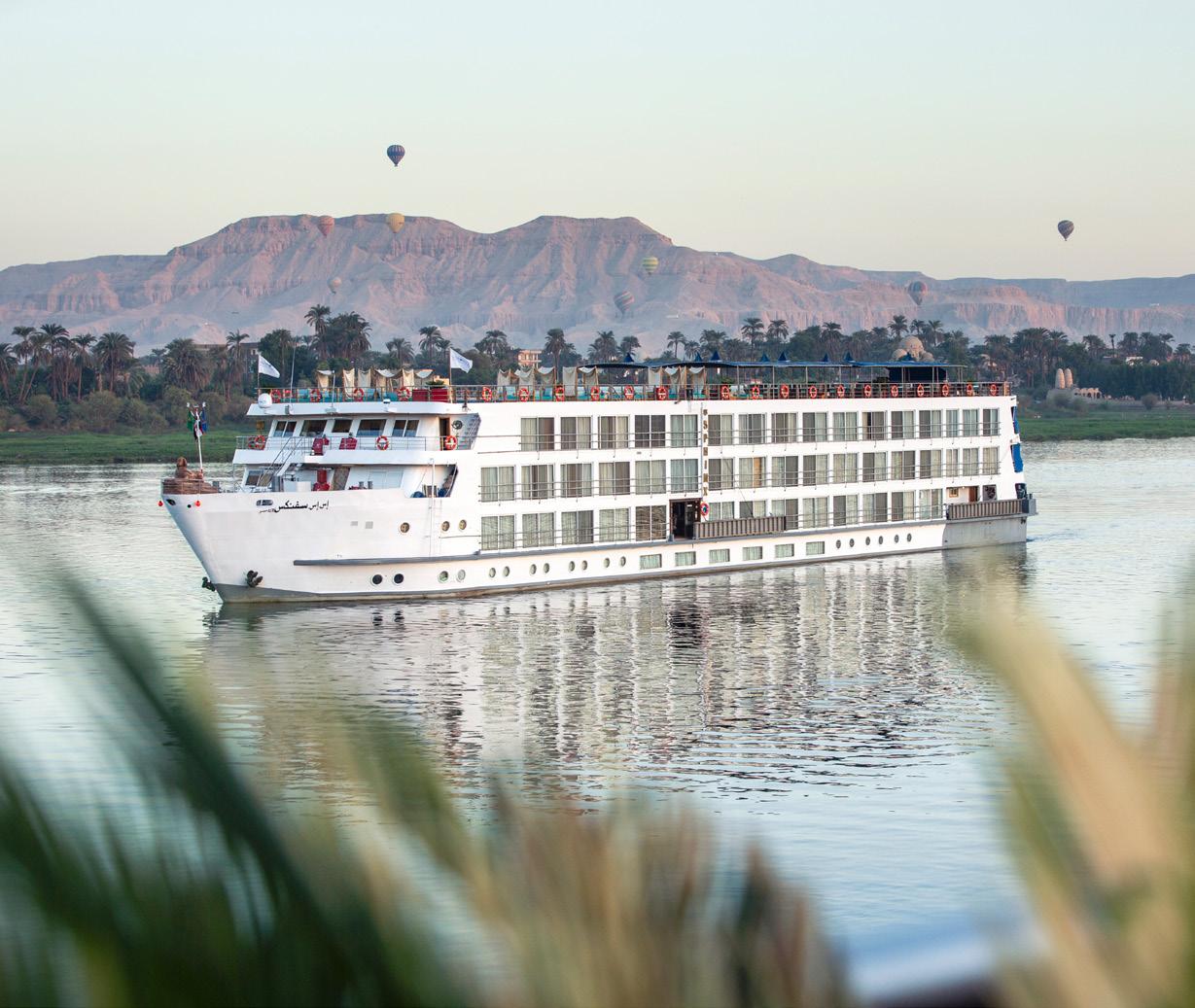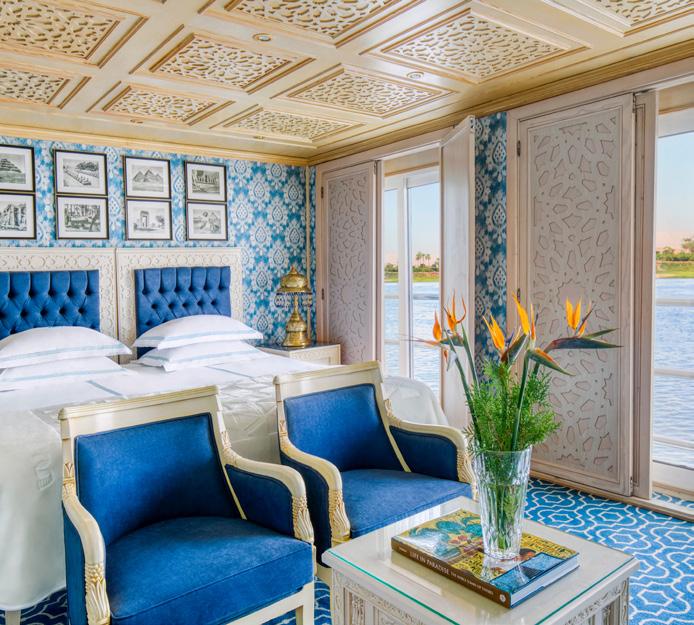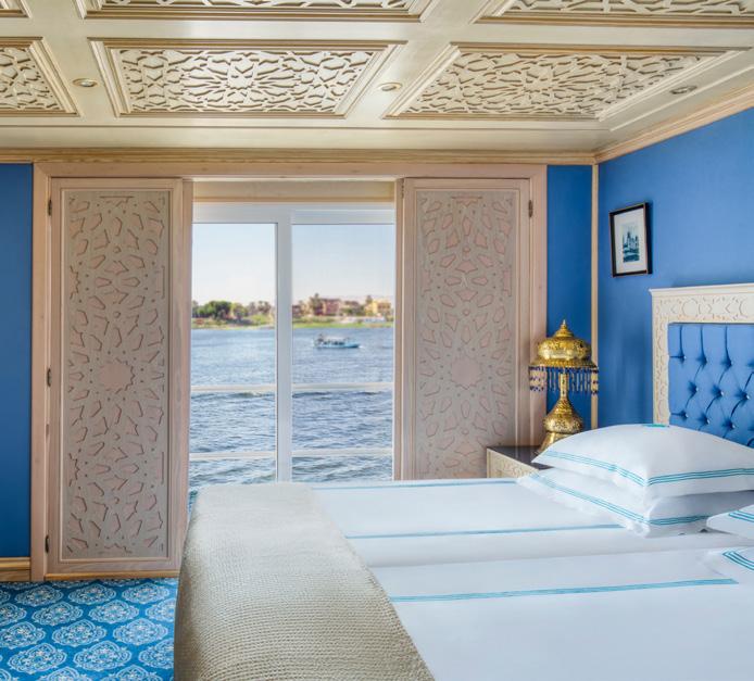 The S.S. Sphinx offers two gourmet dining venues, massage room, swimming pool, 26 gorgeously appointed suites and 16 stunning French balcony staterooms, not to mention, sweeping views of the longest river in the world. This Super Ship offers an immersive onboard experience, with bespoke décor by local artisans and materials sourced regionally -such as fine Egyptian cottons, marble and handcarved blonde wood-to highlight Egyptian craftsmanship while minimising our carbon footprint.
