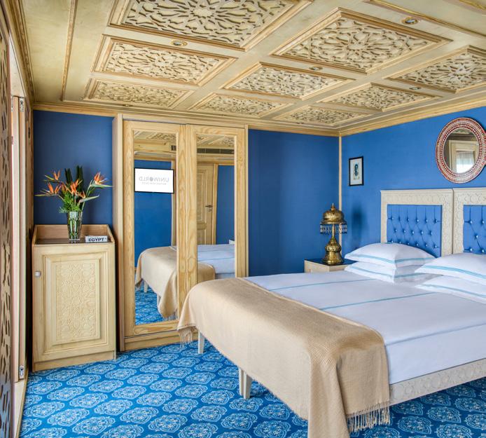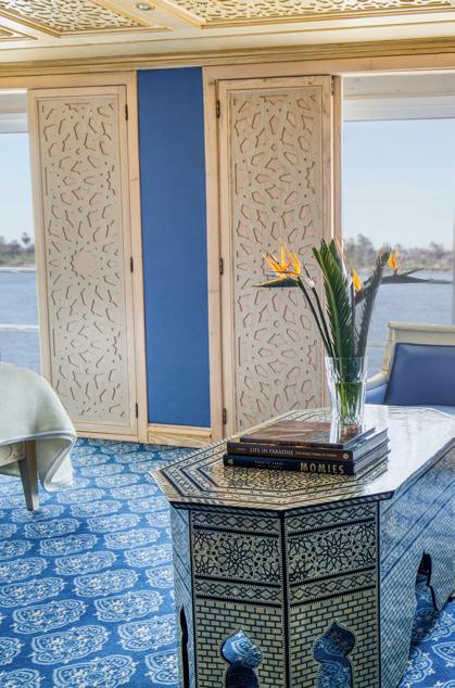 This ship is designed to give guests a sense of Egyptian royalty. The suites and staterooms are awash in shades of Egyptian royal blue, and ornately carved furnishings handcrafted by local artisans.