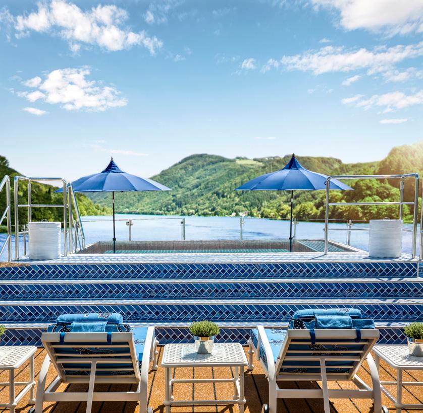Enjoy the passing surroundings as you sail through the region of Bordeaux. Awash with vibrant fabrics, comfortable seating, and an infinity pool overlooking the French countryside, this area is likely to be your favourite onboard.