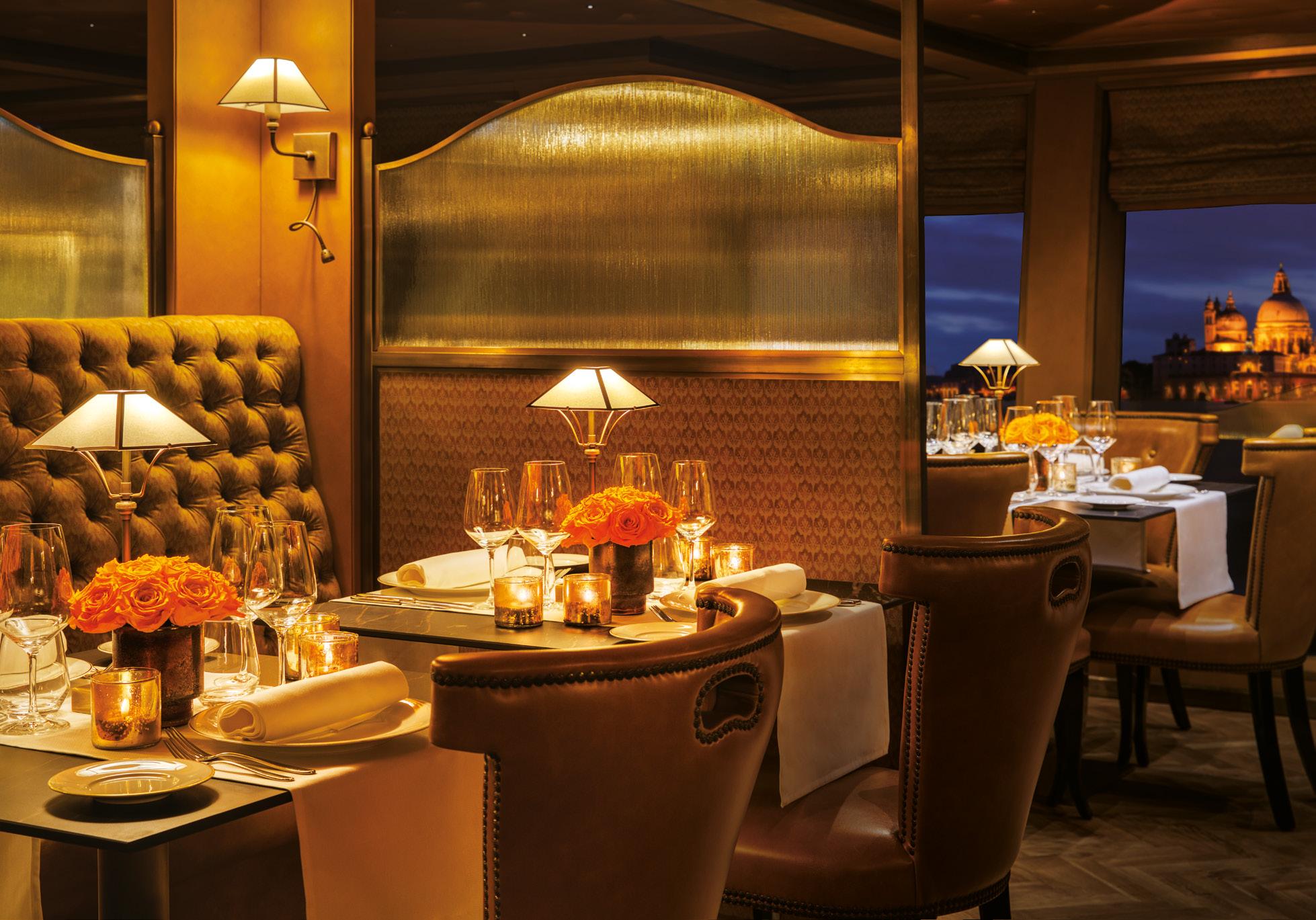 The largest dining venue onboard, is a warm and cosy restaurant, offering traditional Venetian fare. Surrounded by intricately etched panels, inspired by the interior of the Orient Express, the charming booth seating immerses guests in a bygone era of luxury travel while you enjoy the finest cuisine.