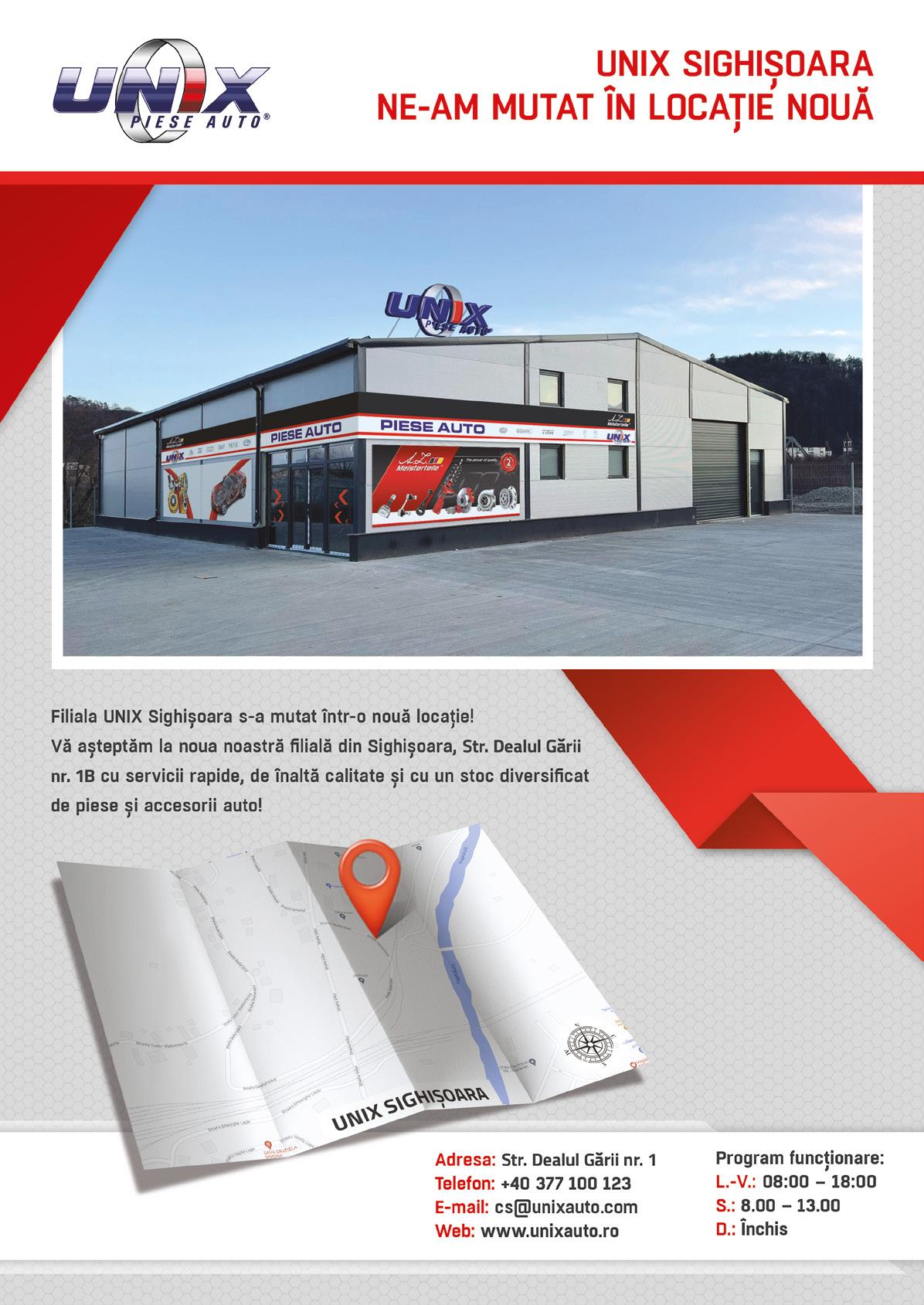 UNIX Auto Ungaria 105 filiale Slovacia 2 filiale România 61 filiale www.unixauto.ro/filiale? www.unixauto.ro/contact | Webshop: www.unixauto.ro Sediul Central din România: RO-400632 Cluj-Napoca Str. Fabricii Nr. 118 Tel.: +40 264 501 899 | Fax: +40 264 441 422 Internet: www.unixauto.ro Filiale din România Alba Iulia 510193 Str. Alexandru I. Cuza Nr. 24 C Tel.: +40 377 100 165 Arad 310318 Calea Radnei Nr. 288 A Tel.: +40 257 271 010 Bacău 600168 Str. Milcov Nr. 3-5 Tel.: +40 234 522 074 Baia Mare 430264 Bld. Republicii Nr. 2 Tel.: +40 262 216 637 Bârlad 731149 Str. Nicolae Bălcescu Nr. 1-3 Tel.: +40 377 100 153 Beiuș 415200 Str. Lucian Blaga Nr. 4 Tel.: +40 377 100 144 Bistrița 420006 Str. Libertății Nr. 41-43 Tel.: +40 374 285 544 Botoșani 710002 Calea Națională Nr. 21 Tel.: +40 374 285 549 Brăila 810521 Str. Ștefan cel Mare Nr. 218 Tel.: +40 377 100 157 Brașov 500010 Str. Nicolae Titulescu Nr. 2 Tel.: +40 268 476 692 Brașov II 500222 Str. Hărmanului Nr. 49 Z Tel.: +40 377 100 161 București I 012381 Sect. 1 Șos. Chitilei Nr. 12 Tel.: +40 374 207 700 București II 022523 Sect. 2 Șos. Andronache Nr. 157 Tel.: +40 212 404 205 București III 031083 Șos. Dudești-Pantelimon Nr. 101 Tel.: +40 374 206 696 București IV041719 Sect. 4 Str. Aurel Perșu Nr. 2-10 Tel.: +40 377 100 120 București V 050156 Sect. 5 Șos. Viilor Nr. 14 Tel.: +40 213 189 890 București VI 061971 Sect. 6 Str. Valea Oltului Nr. 199 - 201 Tel.: +40 217 777 077 București Crângași 060339 Str. Mehadiei Nr. 41 Tel.: +40 377 100 162 Buzău120226 Șos. Spătarului Nr. 26 Tel.: +40 377 100 163 Câmpulung 115100 Str. Pictor Grigorescu Nr. 1 Tel.: +40 377 100 129 Caracal 235200 Str. Vornicu Ureche Nr. 2 Tel.: +40 377 100 143 Cluj-Napoca 400632 Str. Fabricii Nr. 118 Tel.: +40 264 441 444 Cluj-Napoca II 407281 Luna de Sus, Drumul DN1 Km 490+13 Tel.: +40 377 100 155 Constanța 900301 Șos. Industrială Nr. 6 Tel.: +40 241 552 226 Craiova 200501 Calea Severinului Nr. 39 Tel.: +40 251 426 444 Curtea de Argeș 115300 Str. 1 Mai Nr. 5 Tel.: +40 377 100 121 Dej 405200 Str. 1 Mai Nr. 97A Tel.: +40 377 100 166 Deva 330158 Str. Dorobanților Nr. 34 Tel.: +40 374 290 290 Dorohoi 715200 Str. Salciilor Nr. 40 Tel.: +40 377 100 122 Drobeta-Turnu Severin 220139 Str. Traian Nr. 159 A Tel.: +40 377 100 160 Făgăraș 505200 Str. Uniunii Nr. 7 Tel.: +40 377 100 138 Galați 800396 Str. Brăilei Nr. 272 Tel.: +40 236 425 255 Iași 700382 Str. Aurel Vlaicu Nr. 78 Tel.: +40 232 262 660 Lugoj 305500 Str. Timișorii Nr. 113 Tel.: +40 377 100 124 Mangalia 905500 Str. M. I. Dobrogeanu Nr. 20 B Tel.: +40 377 100 159 Marghita 415300 Str. Pop Mircea Nr. 17 Tel.: +40 377 100 128 Mediaș 551010 Str. Gării Nr. 2 Tel.: +40 377 100 126 Onești 601115 Str. Redului Nr. 8 Tel.: +40 377 100 156 Oradea 410266 Calea Sântandrei nr. 28 Tel.: +40 259 475 453 Oradea II 410060 Calea Clujului Nr. 144-148 Tel.: +40 377 100 127 Petroșani 332071 Str. Livezeni Nr. 7 Tel.: +40 377 100 125 Piatra Neamț 617185 Str. Dumbravei Nr. 12 Tel.: +40 374 204 604 Pitești 117045 Albota Str. Ecologiei Nr. 790 C Tel.: +40 248 224 261 Ploiești 100070 Sat Blejoi Republicii Nr. .11 PH Tel.: +40 244 542 055 Rădăuți 725400 Calea Cernăuți Nr. 42 B Tel.: +40 377 100 169 Râmnicu Vâlcea 240300 Str. Horia Nr. 1-3 Tel.: +40 374 207 702 Reșița 320210 Str. Făgăraşului Nr. 18 C Tel.: +40 377 100 151 Roman 611052 Artera Vest nr. 40 Tel.: +40 377 100 152 Satu Mare 440101 Str. Botizului Nr. 24 Tel.: +40 261 770 360 Sibiu 550024 Bld. Victoriei Nr. 42 Tel.: +40 269 221 262 Sighetu Marmației 435500 Str. Avram Iancu Nr. 233 A Tel.: +40 377 100 148 Sighișoara 545400 Str. Dealul Gării nr. 1B Tel.: +40 377 100 123 Slatina 230048 Str. Pitești FN Tel.: +40 377 100 158 Slobozia 920095 Șos. Brăilei Nr. 1 Tel.: +40 377 100 168 Suceava 727525 Com. Scheia, Str. Humorului Nr. 39 Tel.: +40 230 533 310 Târgoviște 130083 Str. Tudor Vladimirescu Nr. 65 Tel.: +40 374 279 517 Târgu Jiu 210177 Str. Gen. Titus I. Gârbea Nr. 3 Tel.: +40 374 203 102 Târgu Mureș 540210 Str. Gheorghe Doja Nr. 197 Tel.: +40 265 314 010 Timișoara 300642 Str. Miresei Nr. 1 Tel.: +40 256 474 701 Turda 401096 Str. Avram Iancu Nr. 1-3 Tel.: +40 374 282 680 Zalău 450090 Bld. Mihai Viteazul Nr. 58 C Tel.: +40 374 203 780