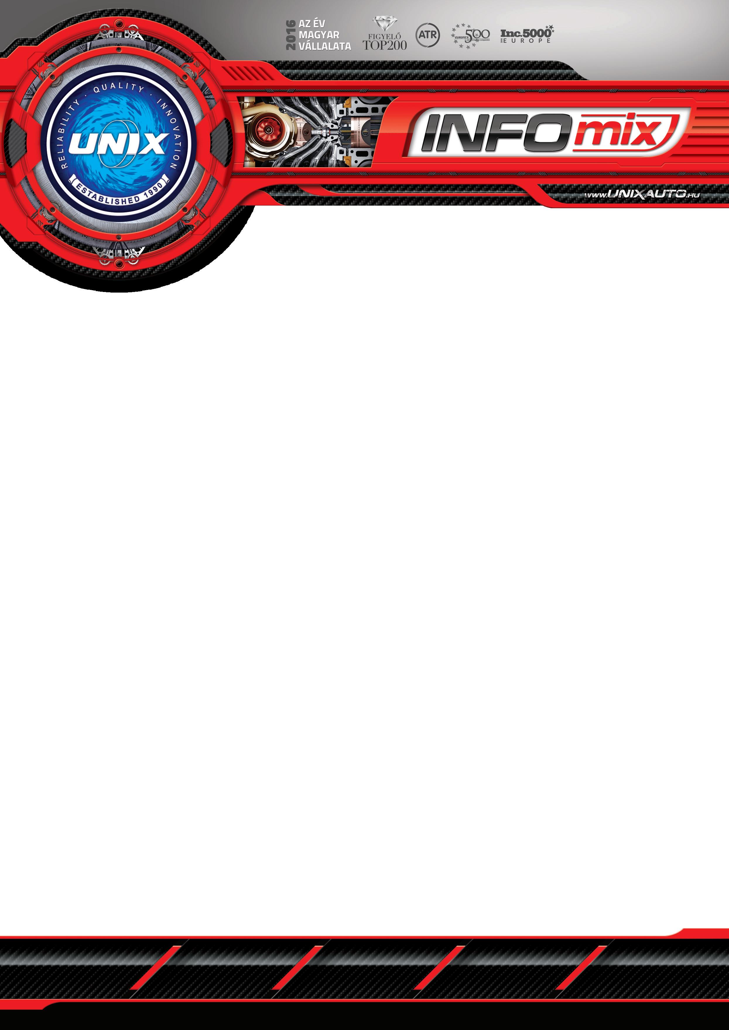 Az UNIX INFOmix az UNIX Autó Kft. információs lapja | Megjelenik havonta 20 000 példányban Szerkesztőség: 1139 Budapest, Frangepán u. 55-57. | Kapcsolat: www.unixauto.hu/kapcsolat Felelős kiadó: Zombori Antal | Az árak tájékoztató jellegűek, az esetleges változásokért és az újságban előforduló nyomdai hibákért felelősséget nem vállalunk.