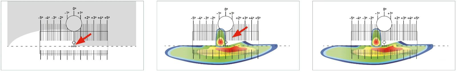 A világos tartomány a bal fényszóró fényeloszlását ábrázolja. A világos és sötét közötti függőleges határt (piros nyíl) a nullvonalra kell állítani. A jobb oldali fényszóró esetében pedig ennek a tükörképe szerint.