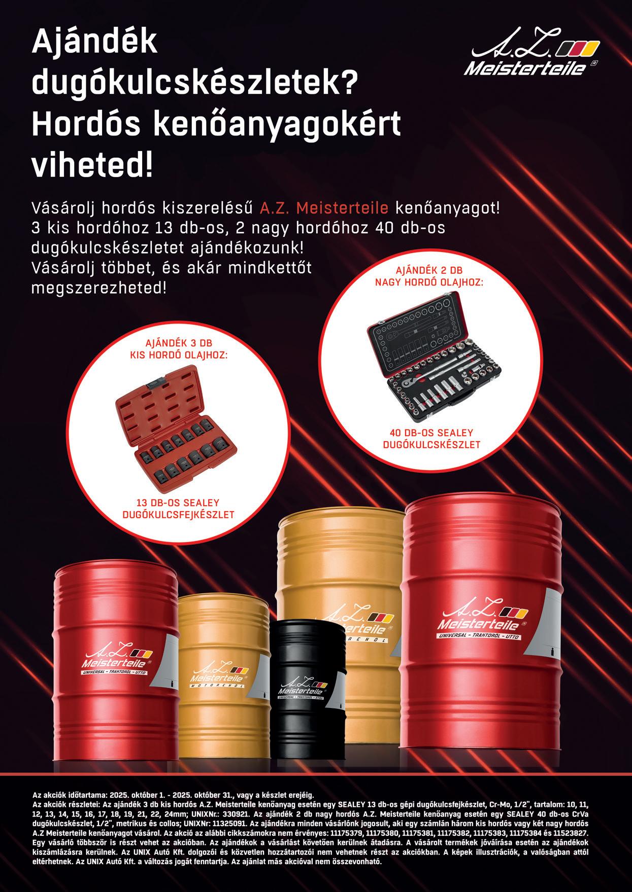 Jelentős célszerszám-választékkal készültünk, és a roadshow-n már előzetesen lehetett regisztrálni őszi akkumulátorkihelyezési akciónkba is. Ez egy nagyszerű lehetőség minden szerviz számára, ahol nem akarnak beruházni nagy készletbe, de szeretnének bármikor kézközelben egy megfelelő csereakkumulátort a hideg idő beköszöntével egyre gyakoribbá váló akkuhibák megoldására. Az UNIX vállalja, hogy egy csinos A.Z. Meisterteile fémállványon 7 db-os A.Z. Meisterteile akkumulátor-kínálatot – 40 Ah-tól 100 Ah-ig –telepít minden jelentkező szervizbe. Méghozzá mindezt bizományba, egyetlen fillér befektetés nélkül. Alkatrészkiszállítóink az állványról hiányzó beszerelt akkumulátorokat a fogyás alapján folyamatosan utántöltik, így gondoskodnak arról, hogy bármikor, azonnal rendelkezésre álljon a legygyakoribb akkumulátorok egyike a javítás megkezdéséhez.