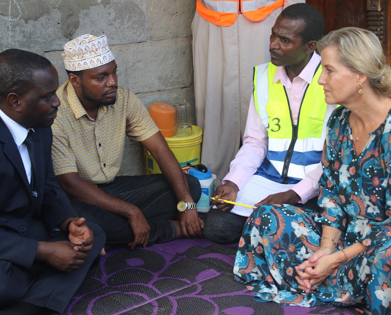 the Duchess of Edinburgh listens to a community member who received treatment alongside a community drug distributor during her visit to a MoH/Unlimit Health supported mass drug administration (MDA) in Zanzibar.