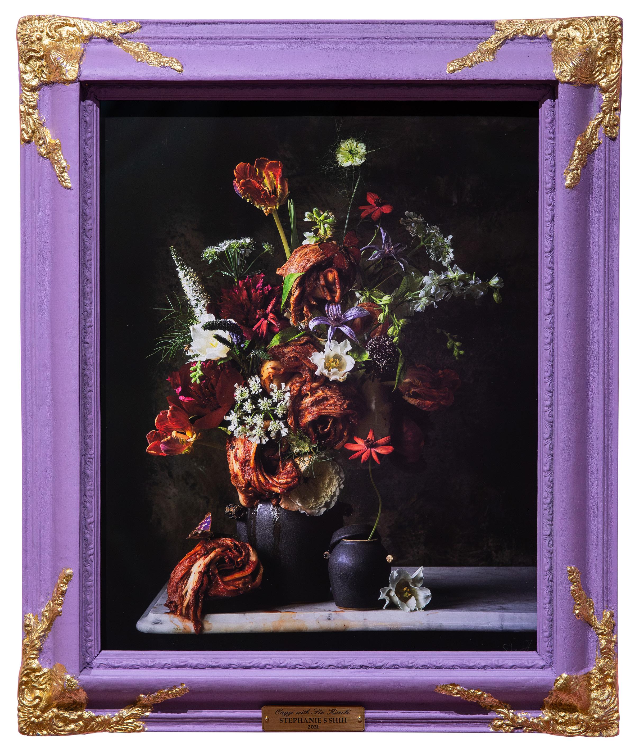 Referring to The First Slice, she writes, “My oldest childhood friend and I grew up with Oakland Chinatown birthday cakes like this one from Napoleon Super Bakery (拿破崙餅) gracing our tables every celebration. When we got older, we continued to order from the same bakeries ourselves using our out-of-practice Chinese language skills (which resulted in ordering accidents like all-pink cakes that became part of our traditions).” In Onggi with Six Kimchi, she directs our attention to Korean American foodways by including juicy curls of kimchi that gently hint at the variegated red and white streaks of the Rembrandt tulips that were highly prized by the Dutch. She stands the bouquet in a vase modeled on an onggi–a Korean clay pot traditionally used for kimchi fermentation. As part of her practice, Shih credits the local businesses and artisans who provided her with materials. She notes that the kimchi was created by Oliver Ko of Korilla Kimchi and the ceramics by ceramicist Eunbi Cho, while the cake slice in First Slice was carved by the sculptor Lap Ngo.