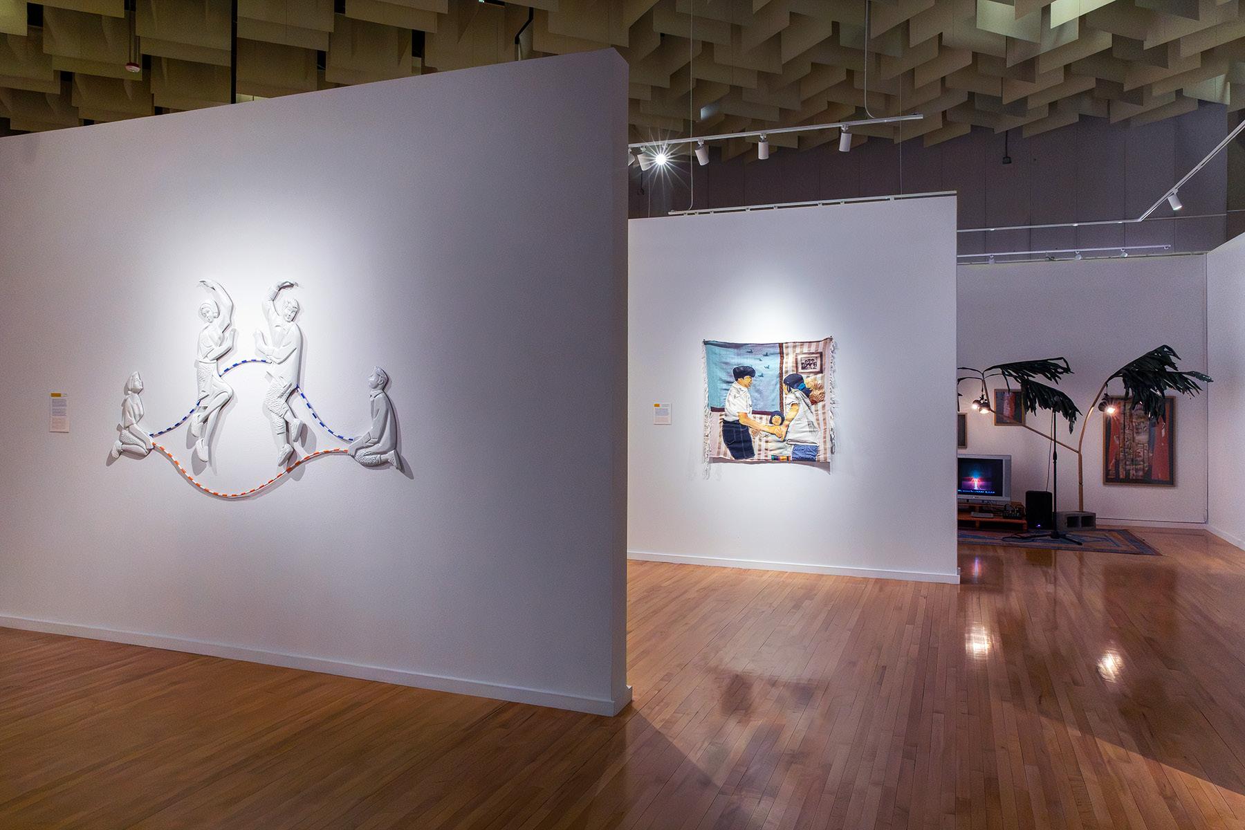 The artists are inspired by personal experiences informed by historical events that have shaped their diasporic identities. Some of them call on their memories of home, remembering favorite activities such as karaoke, reassessing their childhood relationships with their parents from a position of adult maturity, or contemplating the future that awaits their own children. Others employ historical research, considering the incarceration of Japanese Americans during World War II, or the Filipino Rough Riders who traveled with Buffalo Bill’s Wild West in the late 1800s. The links between past, present, and future are manifested in everyday objects like balikbayan boxes, or in the frustration of English-language autocorrect technology replacing a person’s name with an anglicized alternative.