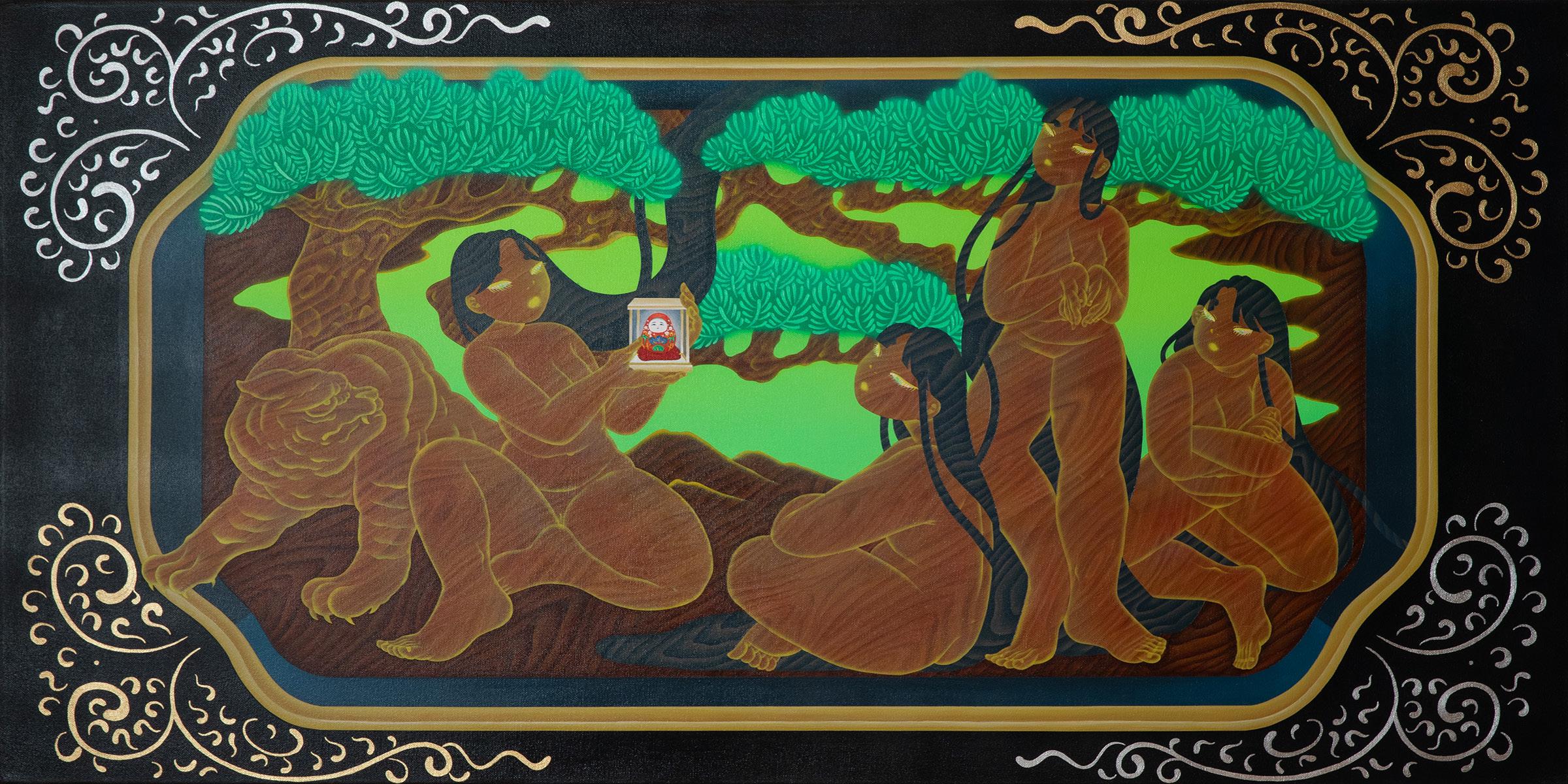 Growing up biracial, she attended school in both California’s Bay Area and Kanazawa in western Japan. In A Word That Doesn’t Exist・存在し ない言葉, she remembers the classroom experience of unsuccessfully trying to find a word that meant “diversity” in Japanese on a mechanical translator. In other paintings she reimagines Japanese spirit beings as contemporary women who wear up-to-date nail art on elegant fingers inspired by ukiyo-e imagery from the Edo period. Cultural migration takes on a physical shape. Can the spirits migrate, just like people? Or do they only stay in Japanese homes? The question is heightened by the knowledge that these spirits are traditionally formed by the accumulated energy of families living in a single place for years. Double Belonging is inspired by fragments of the wooden Buddhist altar that she brought from her late grandmother’s house in Kanazawa to her home in the United States. By replacing the original picture of Buddhist monks with a group of her women holding up a Kaga Hachiman Okiagari—a figure from Japan’s other official religion, Shintoism— Fuji shows us that a whole, complete form can be made up of things that espouse doubleness, and that have “shifted and morphed.”