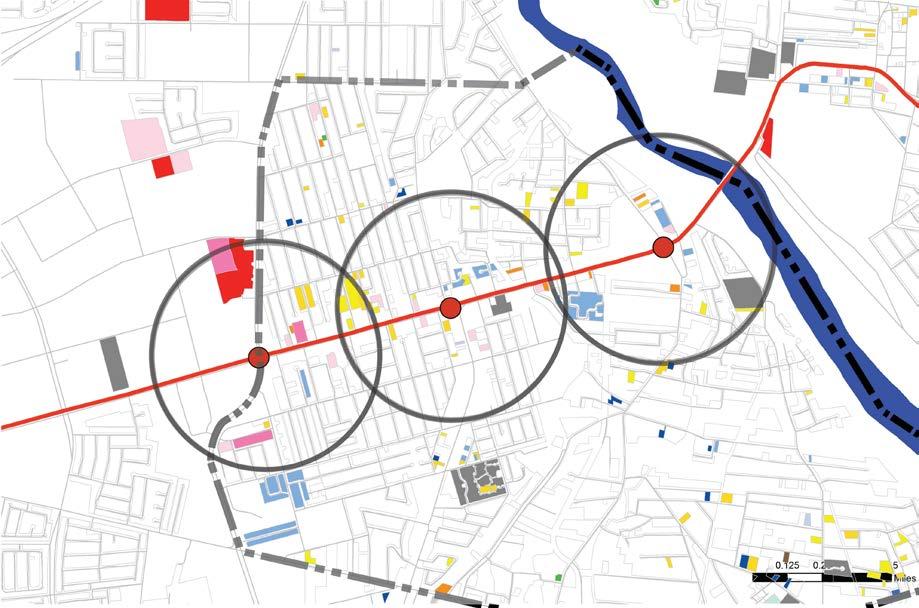 • New zoning that takes into account existing conditions—along with higher density, mixed use, and reduced parking—within the TOD vision.