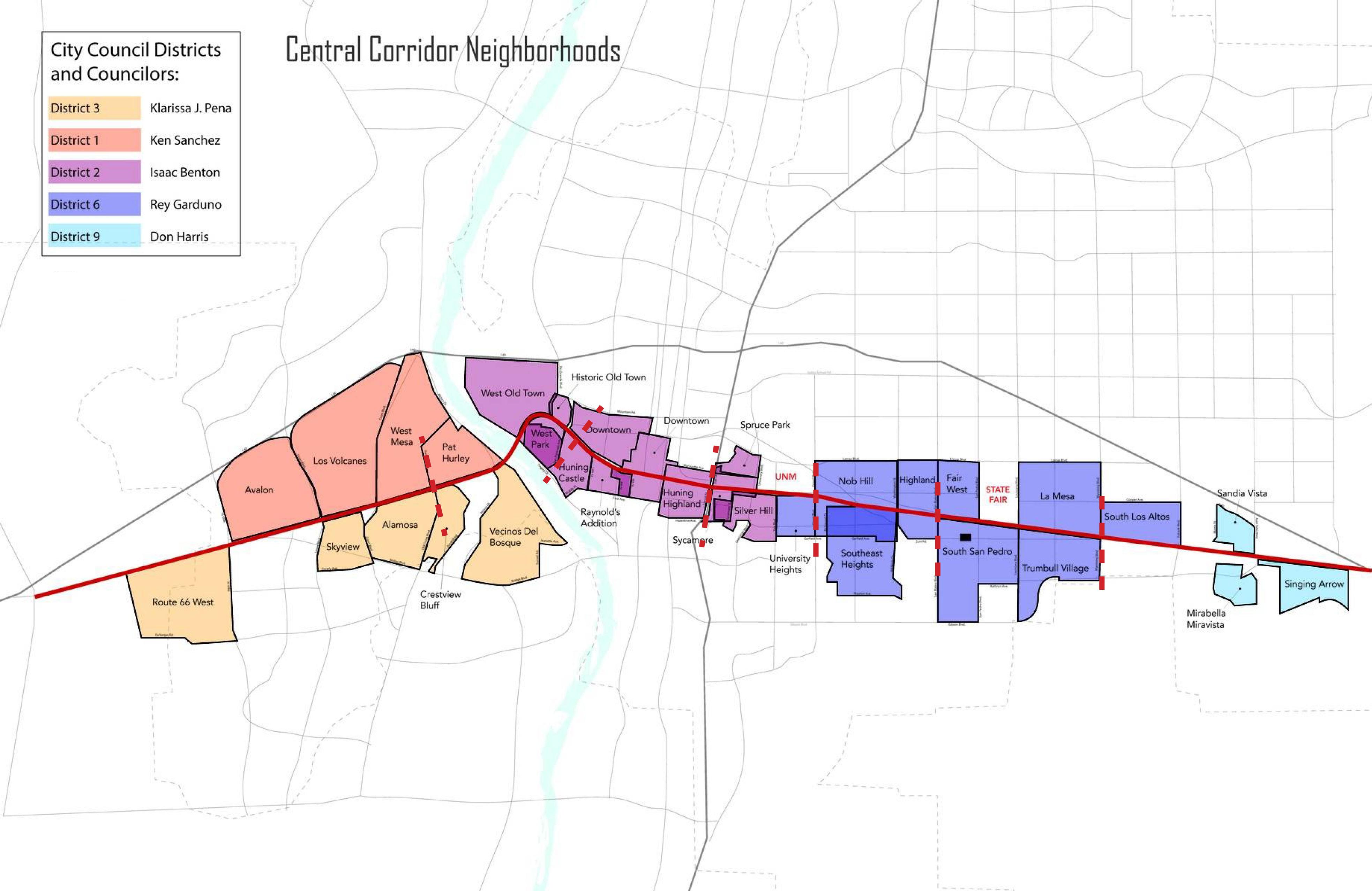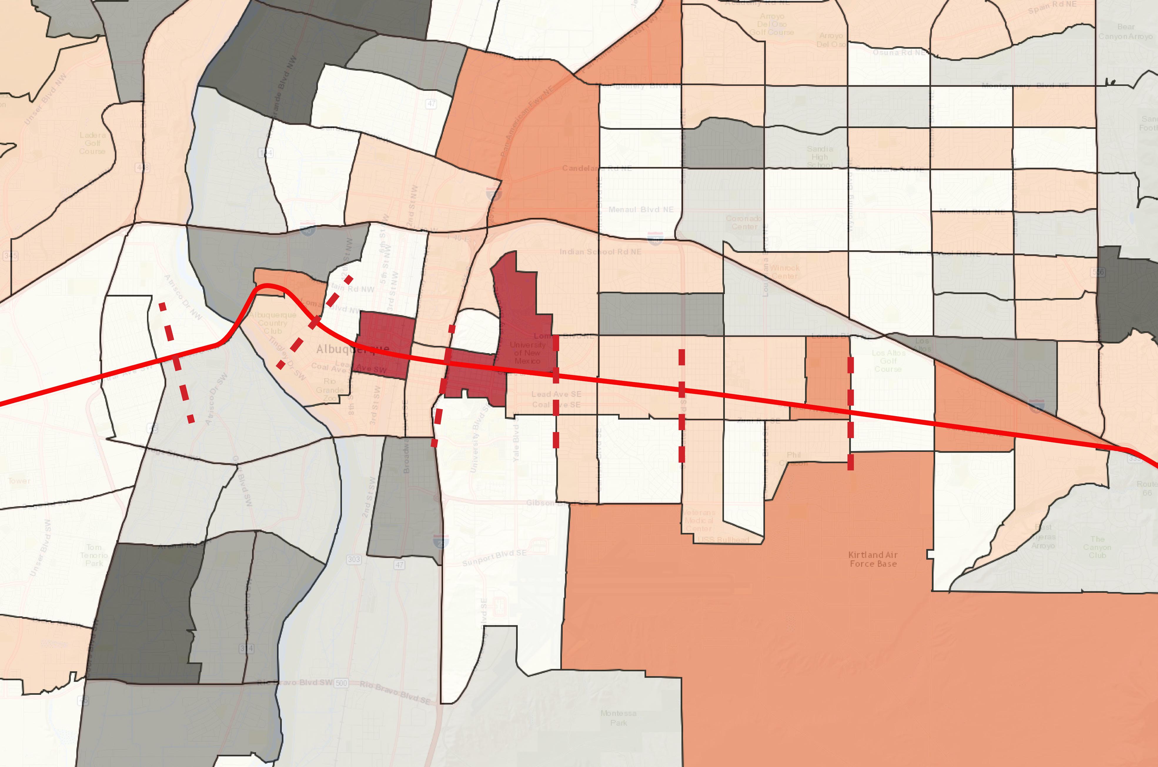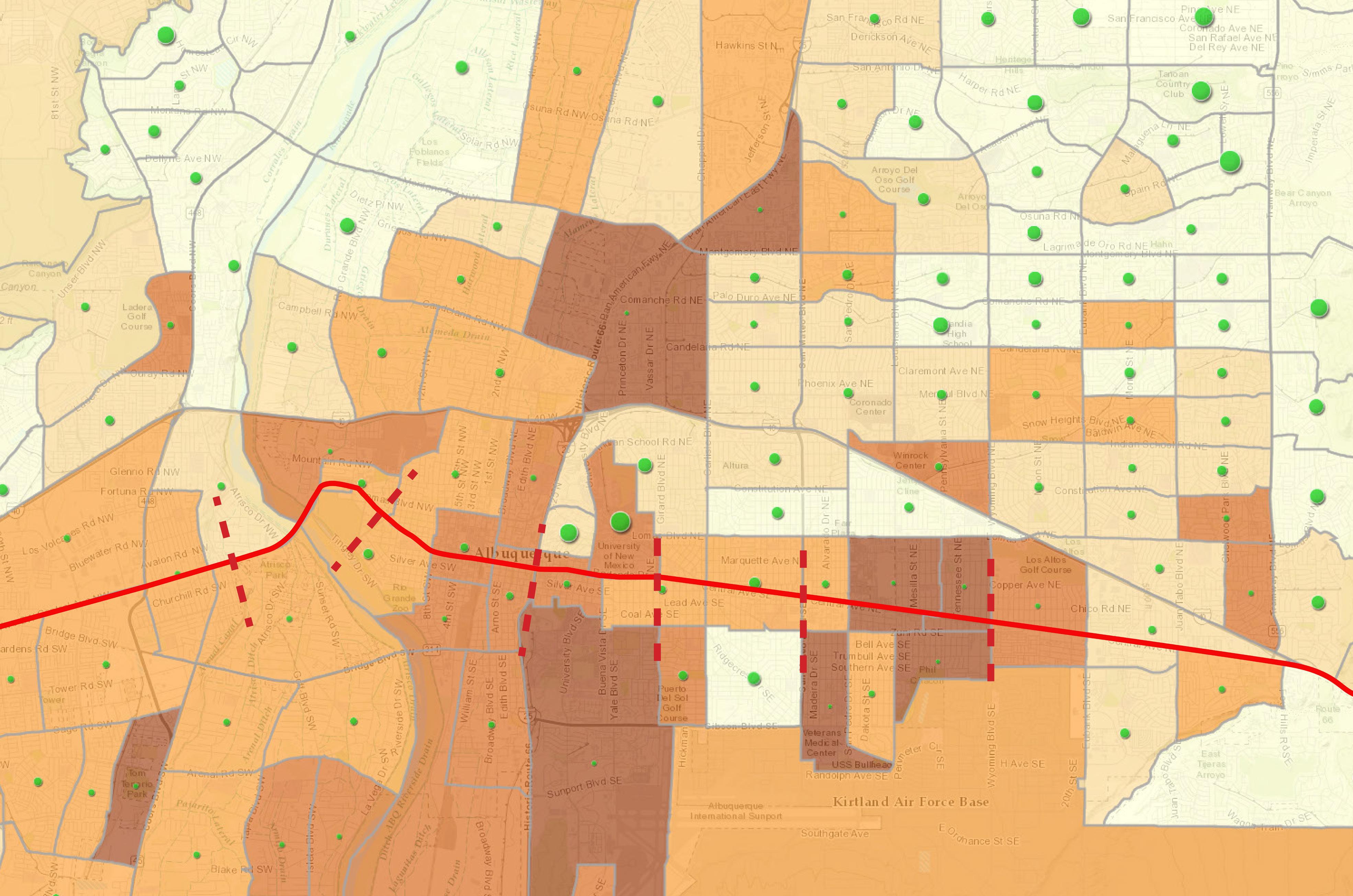 The UNM research team will collect and analyze data to identify areas of opportunity and risk; identify promising practices for maximizing benefits (community and economic). We will work with community stakeholders to conduct a research study to identify ways in which current public investments—comprehensive plan, zoning code, and bus rapid transit—might impact and/or reposition communities along the Central Avenue corridor. Our approach uses social determinants of health to select, gather, and analyze data and then make recommendations for additional improvements and/or policy controls that we think will 1) improve quality of life, health and wellbeing in neighborhoods proximate to ART station areas, 2) welcome and shape new development, and 3) provide neighborhood stability in the context of change.