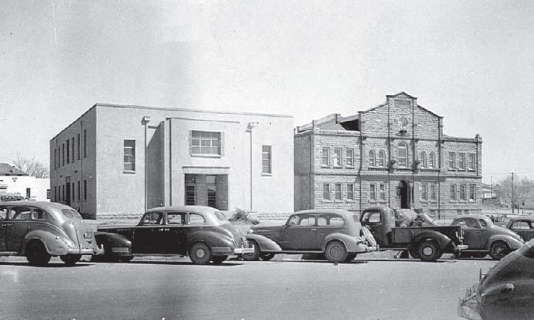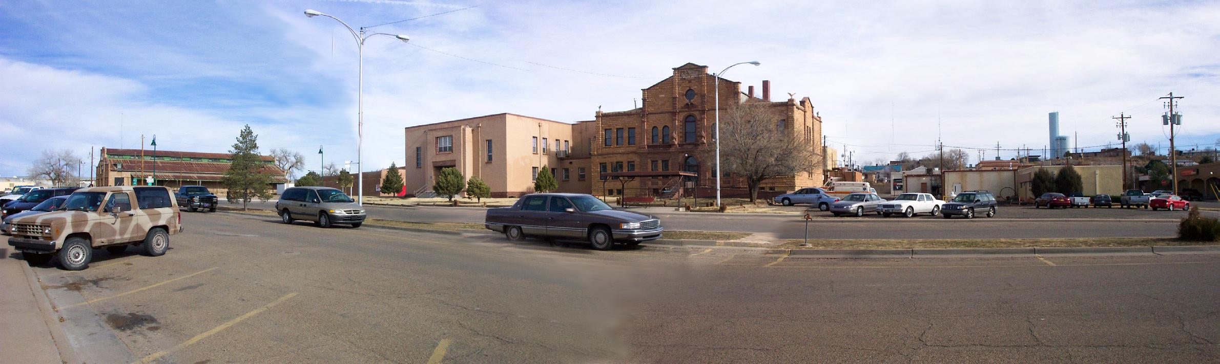When the new railroad town of Santa Rosa rested the Guadalupe County seat from Puerto de Luna in 1903, a city block near the depot was quickly designated as the site for a courthouse. The new courthouse built near the center of this block in 1908 was soon joined by radial walkways, benches and shade trees. In 1940, Santa Fe architects Kruger and Clark designed new wings to be added to either side of the original building. The addition to the left was completed in 1946, but the mirror addition to the right was never undertaken. A city hall was instead added at the far eastern corner of the square, joined later by a jail and two small buildings behind the courthouse, which destroyed the symmetry and formality of the courthouse and its square. Then in the 1970s, fragments of the square in front of the original entrance were further whittled down to create additional parking spaces.