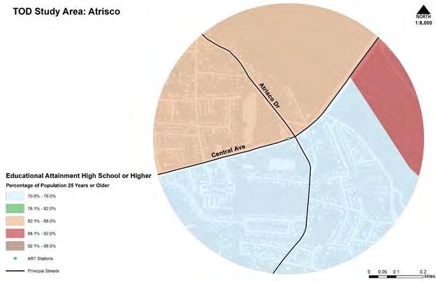 Figures27through30showthepercentageofpopulation25yearsorolderwhoseeducationalattainmentisa HighSchooldiplomaorequivalency,andhigher.TheAtriscoTODstudyarea’spopulationindicatedthroughtheUS 2015ACS5-yearestimatethat74.5%ofthepopulationhaveahighschooldiplomaorpost-secondarydegree.This percentageiscalculatedbycombiningallcensustractareas.ThelowestpercentagerangewithintheAtriscoTOD studyareaisbetween70.8%and76%.ComparedtoallotherTODstudyarea,theAtriscoTODstudyareahasthe lowestpercentageofpopulationofhighschooldiplomasorpost-secondarydegrees.TheOldTownTODstudyarea isestimatedtohaveanestimated90%populationwithahighschooldiplomaorequivalency,orpost-secondary educationdegree.TheportionwithintheOldTownTODstudyarea½mileradiuswiththelowestpercentageof highschooldegreeorhigherisbetween82.1%and88%.TheUniversityTODstudyareacontainsthehighest populationwithahighschooldegreeorhigherat93.5%.Asthemajorityoftheresidentsarecurrentlypostsecondarycollegestudentinpursuitofadegree,partofthisareawithahighschooldegreeisestimatedbetween 92.1%and98%.ThishighpercentageisfollowedbytheSanMateoTODstudyareawithanestimated92.1%ofthe populationwiththe½mileradiustohaveahighschooldiplomaorequivalencyorpost-secondaryeducation degree.