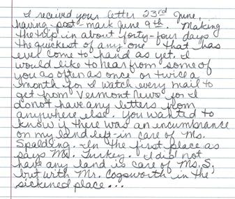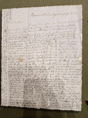 Since taking the photo of Jacob Parrish’s letter to his father, I wondered to myself if I could successfully dictate the rest of it. It was only one paragraph which doesn’t tell me a lot about Mr. Parrish. With paper and pen at hand, I wrote down what each word looked like to me (see two images on the following page). The beginning of the dictation was rough. I had to zoom in to 59%. Even at that point, I did not want to give it a go. During the process, I mistook the last name Tucker for Turkey. There is a closeness between the lowercase “c” and lowercase “r” when they are connected from the previous letter to the next. I did notice that my reading adjusted to the curls of the letters the more I read them. It is a lot like focusing in and out of an image through a scope or the optometrist making minor adjustments to figure out what prescription lens strength you require for reading glasses. I didn’t want to stop, but figured I would give my brain a rest after all of that exercising. I would not have been able to read Jacob’s letter if it were not for learning how to write in cursive. Thank you, Jacob, for sharing with me how much you miss the people that you loved during the age of the gold rush in California.