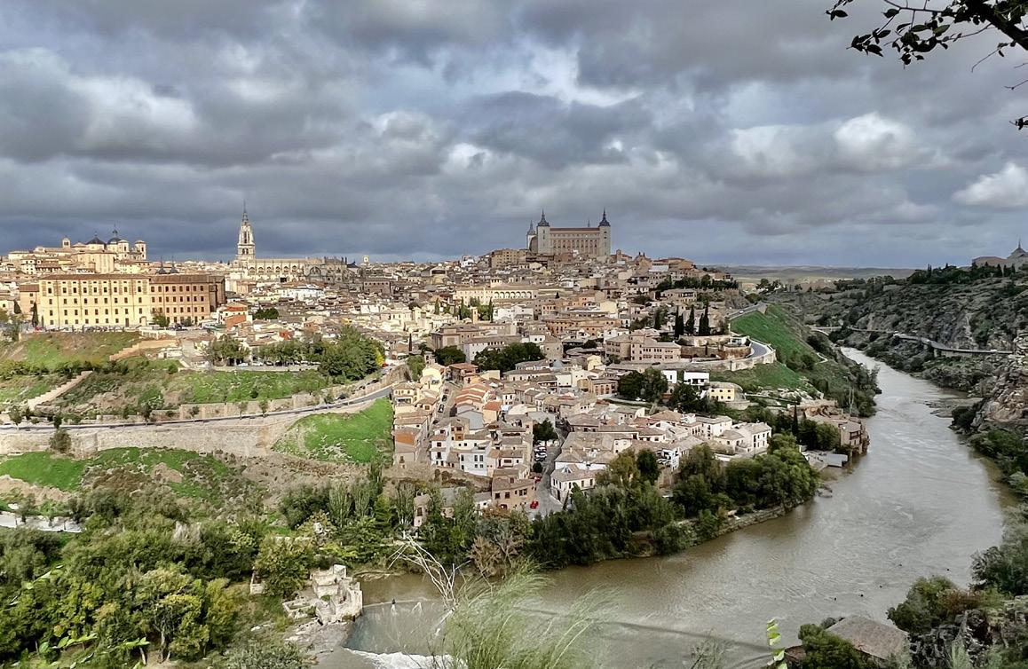 A panoramic view of the historic city of Toledo, with the Rio Tajo flowing by