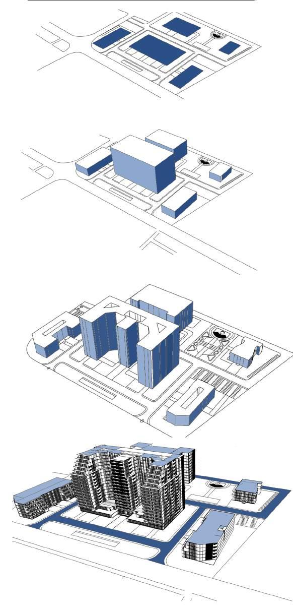 Detailed massing - stepped terraces are provided , common characteristics for all main blocks and providing space for vegetations