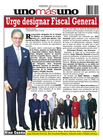 econocidos abogados de la Ciudad de México, se reunieron en el programa ¿Y… usted qué opina?, conducido por Nino Canún, en el que debatieron sus opiniones acerca de la situación que vive el país en materia de seguridad y justicia. El panel, estuvo conformado por María de la Parra, maestra en Justicia Penal y Seguridad Pública; Karla Martino Peña, abogada experta en materia laboral; Leopoldo Baeza, experto en derecho laboral; Jorge Eduardo Pascual, presidente de la Institución Nacional para la Celebración del Día del Abogado; Alex Tonatiuh Márquez, maestro en Derecho; y los catedráticos de la Facultad de Derecho de la UNAM, Eduardo Sadot y Virgilio Serrano. El tema principal, fue la designación del nuevo fiscal general de la Nación, donde los abogados reprobaron las acciones tomadas por las autoridades mexicanas, al mantener acéfala esta dependencia. Y es que de acuerdo con Leopoldo Baeza, la falta de un fiscal ha sido tomada como bandera de la delincuencia común y organi-