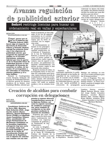 LUNES 10 DE MARZO DE 2014 comercial en bienes del dominio público del Distrito Federal, excepto los nodos que sean dispuestos para tal efecto". Durante 2013 la ventanilla sólo recibía solicitudes de colocación de cuatro delegaciones: Álvaro Obregón, Benito J u á r e z , Cuauhtémoc y M i g u e l