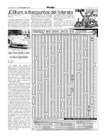 La capital del estado de Aguascalientes, la ciudad que lleva el mismo nombre, será la sede del último compromiso de la temporada 2010 de la Nascar México. Evento que se llevará a cabo en los próximos días 20 y 21 de noviembre dentro de las instalaciones del Nuevo Autódromo de Aguascalientes y en donde estarán presentes los pilotos Rubén García Novoa y Alex Capín, integrantes del equipo Quaker State. Sin duda, los conductores Germán Quiroga, Homero Richards y Antonio Pérez son quienes llamarán la atención pues entre ellos tres se definirá al nuevo campeón de los autos Stocks. El capitalino Quiroga (2013 unidades) es quien llega en el liderato de la tabla de clasificaciones con 140 puntos por delante de su más cercano contrincante, Homero Richards (1873), el cual a su vez, tiene 44 tantos de ventaja por delante de Antonio Pérez (1829), el ocupante del tercer sitio general. Quiroga, Richards y Pérez no serán los únicos competidores que buscarán subir al Victory Lane del evento en Aguascalientes. Más allá de la pelea por el campeonato y debido a que ya se empiezan a hacer los enroques de equipos y pilotos para la temporada del 2011, habrá alrededor de cuatro o seis pilotos que se encuentren con posibilidades reales de llevarse el triunfo en esta competencia sobre terreno hidrocálido, entre ellos, Rafael Martínez, Hugo Oliveras, Salvador Durán, Jorge Goeters y, por supuesto, Rubén García Novoa y Alex Capín, quienes de la mano con Quaker State saldrán a la pista a pelear por ese primer sitio que se les ha negado en el año.