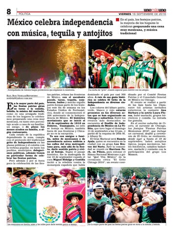 tas patrias, rebasa las fronteras de México, con el suculento pozole, tacos, tequila, sombreros, bailes y mucho orgullo patrio forman parte de los festejos este fin de semana en los Estados Unidos de Norteamérica, donde se conmemorará el 206 aniversario de la Independencia de México. El histórico movimiento que se inició el 16 de septiembre de 1810 en Dolores, Guanajuato, no sólo se festeja en México, también fuera de sus fronteras y Chicago no es la excepción. Ya sea con amigos o familia, miles de mexicanos o de ascendencia azteca saldrán a las calles del área metropolitana para, más allá de la fiesta, darle sentido patrio y cívico al festejo. Según el pasaje histórico, fue la madrugada de ese 16 de septiembre cuando el cura Miguel Hidalgo y Costilla incitó a la rebelión contra la monarquía española que había