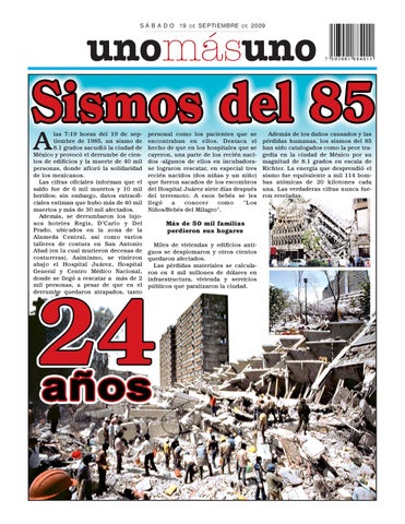 las 7:19 horas del 19 de septiembre de 1985, un sismo de 8.1 grados sacudió la ciudad de México y provocó el derrumbe de cientos de edificios y la muerte de 40 mil personas, donde afloró la solidaridad de los mexicanos. Las cifras oficiales informan que el saldo fue de 6 mil muertos y 10 mil heridos; sin embargo, datos extraoficiales estiman que hubo más de 40 mil muertos y más de 30 mil afectados. Además, se derrumbaron los lujosos hoteles Regis, D’Carlo y Del Prado, ubicados en la zona de la Alameda Central, así como varios talleres de costura en San Antonio Abad (en la cual murieron decenas de costureras). Asimismo, se vinieron abajo el Hospital Juárez, Hospital General y Centro Médico Nacional, donde se llegó a rescatar a más de 2 mil personas, a pesar de que en el derrumbe quedaron atrapados, tanto