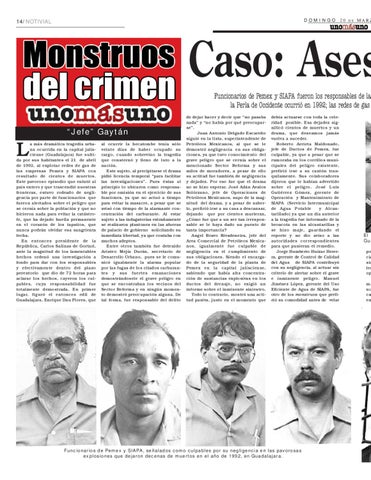 de dejar hacer y decir que “no pasaba nada” y “no había por qué preocuparse”. Juan Antonio Delgado Escareño siguió en la lista, superintendente de Petróleos Mexicanos, al que se le demostró negligencia en sus obligaciones, ya que tuvo conocimiento del grave peligro que se cernía sobre el mencionado Sector Reforma y sus miles de moradores, a pesar de ello su actitud fue también de negligencia y dejadez. Por eso fue que el drama no se hizo esperar. José Adán Avalos Solórzano, jefe de Operaciones de Petróleos Mexicanos, supo de la magnitud del drama, y a pesar de saberlo, prefirió irse a su casa a descansar, dejando que por cientos murieran, ¿Cómo fue que a un ser tan irresponsable se le haya dado un puesto de tanta importancia? Angel Bravo Rivadeneira, jefe del Area Comercial de Petróleos Mexicanos, igualmente fue culpable de negligencia en el cumplimiento de sus obligaciones. Siendo el encargado de la seguridad de la planta de Pemex en la capital jalisciense, sabiendo que había alta concentración de sustancias explosivas en los ductos del drenaje, no exigió un informe sobre el inminente siniestro. Todo lo contrario, mostró una actitud pasiva, justo en el momento que