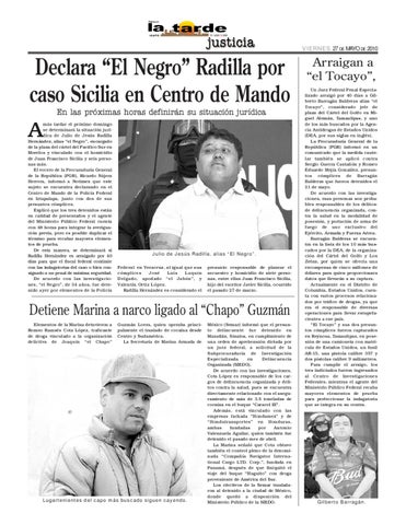 más tardar el próximo domingo se determinará la situación jurídica de Julio de Jesús Radilla Hernández, alias “el Negro”, encargado de la plaza del cártel del Pacifico Sur en Morelos y vinculado con el homicidio de Juan Francisco Sicilia y seis personas más. El vocero de la Procuraduría General de la República (PGR), Ricardo Nájera Herrera, informó a Notimex que este sujeto se encuentra declarando en el Centro de Mando de la Policía Federal en Iztapalapa, junto con dos de sus presuntos cómplices. Explicó que los tres detenidos están en calidad de presentados y el agente del Ministerio Público Federal cuenta con 48 horas para integrar la averiguación previa, pero es posible duplicar el término para recabar mayores elementos de prueba. De esta manera, se determinará si Radilla Hernández es arraigado por 40 días para que el fiscal federal continúe con las indagatorias del caso o bien consignado a un penal de máxima seguridad. De acuerdo con las investigaciones, “el Negro”, de 34 años, fue detenido ayer por elementos de la Policía