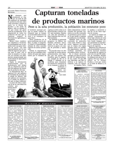 Capturan toneladas de productos marinos Pese a la alta producción, la población los consume poco el territorio nacional porque se puede cultivar en estuarios (que se forman en la desembocadura de los ríos) y en estanques de agua dulce. Otros productos de la pesca mexicana son la sardina, el pulpo, la langosta, el robalo y el guachinango, además de otras cuarenta especies de menor producción. Señala la dependencia que las tres entidades federativas del país más importantes por el volumen de