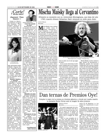 totalmente a mi carrera deportiva”… Como han pasado los años BOB DYLAN, uno de los grandes de la música contemporánea, se identifica por su auténtico mensaje de artista: la sinceridad profesional… EN UN MUNDO de comunicación inmediata, el fracaso lo rechaza permanentemente… SU OBRA MUSICAL “FREEWHLEELIN”, no tiene desperdicio. El álbum entero es portador de esa urgencia de cantar sin retrasos y de atestiguar posiciones políticosociales que no permitan “confusiones” en el arte de vivir y ser felices sin presiones de ninguna especie… CANTANTE COMPROMETIDO, Dylan asimila su pensamiento entre los trovadores populares… EN “SOY LIBRE” dedica un deslumbrante ejercicio de improvisación y evoca a personajes como Brigitte Bardot, John F. Kennedy, Gandhi, Juan Pablo II… EL PRIMER ALBUM de Dylan, titulado simplemente con su propio nombre, anunció una ruptura y propone la de un ser humano en busca de su propia identidad… DYLAN, multimillonario gracias a sus triunfos en el arte musical, “canta y escucha el viento soplar”… BOB dice que la respuesta de la vida está en el viento… Remolino de notas SUSANA DOSAMANTES, madre de Paulina Rubio y excelente actriz, prepara su regreso a las pantallas cinematográficas… “RADIO CENTRO” y “Radio Éxitos” fueron las dos primeras estaciones radiofónicas de Don Pancho Aguirre, en 1952. Entonces la tonada era: “Oigo Radio Centro”… Pensamiento de hoy Las ideas no mueren… ¡CORTE! NAIM LIBIEN KAUI marca un estilo como conductor en “UNOMÁSUNO Radio”, en 35 frecuencias en todo el país. ricardoperete@ yahoo.com.mx