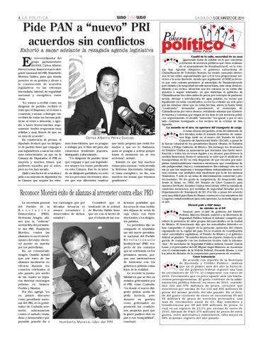 Matías Pascal Candil de la calle, oscuridad de su casa Queriendo tratar de exhibir en lo que concierne a dotación de servicios públicos que viene realizando el ayuntamiento de Nezahualcóyotl, en la colonia San Agustín Atlapulco, el gobierno antorchista de Chimalhuacán de Tolentino Román, ha venido causando destrozos en las calles, argumentando que a él le toca proporcionar servicios a la zona limítrofe, siendo que legalmente el GEM ya decretó que esta colonia pertenece al municipio de Nezahualcóyotl, pero debido a la terquedad del edil antorchista, éste viene desacreditando a su vecino, situación que los colonos ya no están dispuestos a seguir tolerando, ya que mientras el gobierno de Chimalhuacán les cobra miles de pesos por concepto de pavimentación, drenaje e introducción de agua potable, su vecino que legalmente ya están constituidos, no les ha cobrado un solo peso por las mismas obras que ya están hechas, ahora ya hasta están “cuadrando” demandar penalmente al municipio de Chimalhuacán por estos abusos, señalando además que existiendo barrios y colonias que exigen se les dote de los servicios públicos urgentemente, el alcalde ”antorcho” los ignore y por el otro lado continúe hostigando a los vecinos de la colonia de San Agustín. La moneda en el aire, en apertura del transporte de carga A estas alturas del partido, el fin del diferendo de dos décadas sobre el tránsito fronterizo de camiones llega tarde en el marco del Tratado de Libre Comercio de América del Norte (TLCAN), a pesar de la buena voluntad de los presidentes Barack Obama, de Estados Unidos, y Felipe Calderón, de México. Sin embargo, los Teamsters en Estados Unidos ya anunciaron que iniciarán una fuerte movilización y todos los recursos legales a su alcance para detener la medida binacional. Hasta el cansancio se sabe que el sindicato de transportistas de EU no está dispuesto de que circulen por autopistas estadounidenses camiones mexicanos que consideran de alta peligrosidad, viejos y contaminantes. Sin embargo esto no es así ya que las empresas y transportistas independientes mexicanos cuentan con unidades más modernas que la de los mismos Teamsters. Y solo es un tema de discriminación comercial y proteccionismo. No les gusta la competencia. El desacuerdo data desde la firma, en 1994, del Tratado de Libre Comercio para América del Norte. Estados Unidos frenó desde 1994 la entrada de camiones mexicanos, por medidas de seguridad dictadas por el Departamento de Transporte de EU. Por ello a pesar del acuerdo será muy difícil para Barack Obama convencer a los miembros del Congreso estadounidense para esta apertura. La moneda sigue en el aire. Ebrard pide a SSP datos de cárteles en el DF Inusual, pero el jefe de gobierno del Distrito Federal, Marcelo Ebrard, solicitó a la Secretaría de Seguridad Pública federal el informe completo que refiere la presencia de siete grupos del narcotráfico en la ciudad de México. El funcionario dijo que las autoridades federales no han compartido el reporte de la presunta operación del crimen organizado en la capital del país. En la reunión de coordinación entre autoridades capitalinas, el Estado de México y el gobierno federal se planteó: “Si ustedes tienen ese reporte, están en la obligación de compartir con las instancias locales toda la información”. El secretario de Seguridad Pública federal, Genaro García Luna, y el procurador del DF, Miguel Angel Mancera, se reunieron con el comisionado de la Policía Federal, Facundo Rosas, y con los jefes de división de la corporación para ponerse de acuerdo. Crece burocracia De acuerdo con reportes de la Secretaría de Hacienda y Crédito Público, indican que en el primer mes del año la burocracia del gobierno federal registró una tasa de crecimiento de 10.7%, al compararse con enero de 2010. Crecimiento que es preocupante ante las limitaciones presupuestarias. El gasto corriente de la administración pública federal, en enero de 2011, contabilizó 142 mil 976 millones de pesos, recursos que estuvieron por encima de los 124 mil 402 millones de pesos del mismo periodo del año pasado. En el detalle del gasto corriente de enero se encuentran 65 mil 93 millones de pesos de servicios personales, una tasa de crecimiento anual de 4%. Hay subsidios y transferencias por 68 mil 608 millones de pesos, lo cual es un registro de 13.1% por encima de enero de 2010. Además de 9 mil 275 millones de pesos de otros gastos, entre materiales y suministros, cifra mayor en 58% al mismo registro del año pasado
