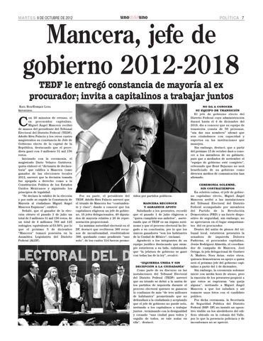 vidos por partidos políticos. MANCERA RECONOCE Y AGRADECE APOYO Saludando a los presentes, recordó que el pasado 1 de julio eligieron a “quien cumpliría sus anhelos”, aseverando que el TEDF es un órgano autónomo y que el proceso electoral ha llegado a su conclusión, por lo que los únicos ganadores “son los habitantes de la Ciudad de México”, exclamó. Agradeció a los integrantes de su equipo jurídico destacando que siempre estuvieron a su lado, enfatizando que “la jefatura de gobierno se ganó con todas las de la ley”, recalcó. “IZQUIERDA UNIDA Y SIN DECEPCIÓN A LA CIUDADANÍA” Como parte de su discurso en las instalaciones del Tribunal Electoral del Distrito Federal (TEDF) aseveró que su triunfo se debió a la unión de los partidos de izquierda durante el proceso electoral quienes se ganaron la confianza de más “de tres millones de habitantes” prometiendo que no defraudará a la ciudadanía y aceptando que el jefe de gobierno no puede solo, invitando a los capitalinos a trabajar juntos , terminando con la desigualdad y creando “una ciudad para todos y orgullo de todos, se vale soñar en ella”, destacó.