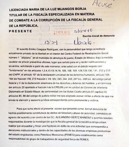 En el documento,presentado el pasado 21 de septiembre de 2022 ante la Fiscalía Especializada en Materia de Combate a la Corrupción,y dirigido a la licenciada María de la Luz Mijangos Borja,Cosgaya concluye que la denuncia presentada en su contra es espuria y que la imputación por la que actualmente permanece en el penal de Almoloya de Juárez se basa en hechos falsos:El coronel señala que la razón de su denuncia es que el agente de Ministerio Público,al "momento de recibir cualquier denuncia,debe analizar los hechos allí plasmados,posteriormente realizar el encuadre entre la conducta desplegada y la norma penal" y verificar la existencia de elementos "objetivos, normativos y subjetivos del tipo penal" para integrar la indagatoria,de conformidad con los artículos 128,129 y 131 del código nacional de procedimientos penales, "lo cual es inconcuso que en el caso concreto no ocurrió".Con base en ello, Cosgaya solicita que un asesor victimal coordine con él las acciones a seguir para "llevar a cabo la correcta integración de la indagatoria" y que "una vez agotadas todas y cada una de las diligencias de investigación correspondientes,se sirva de consignar la carpeta de investigación ante el juez de control en turno a efecto de que se continúe el presente asunto por parte del Poder Judicial"