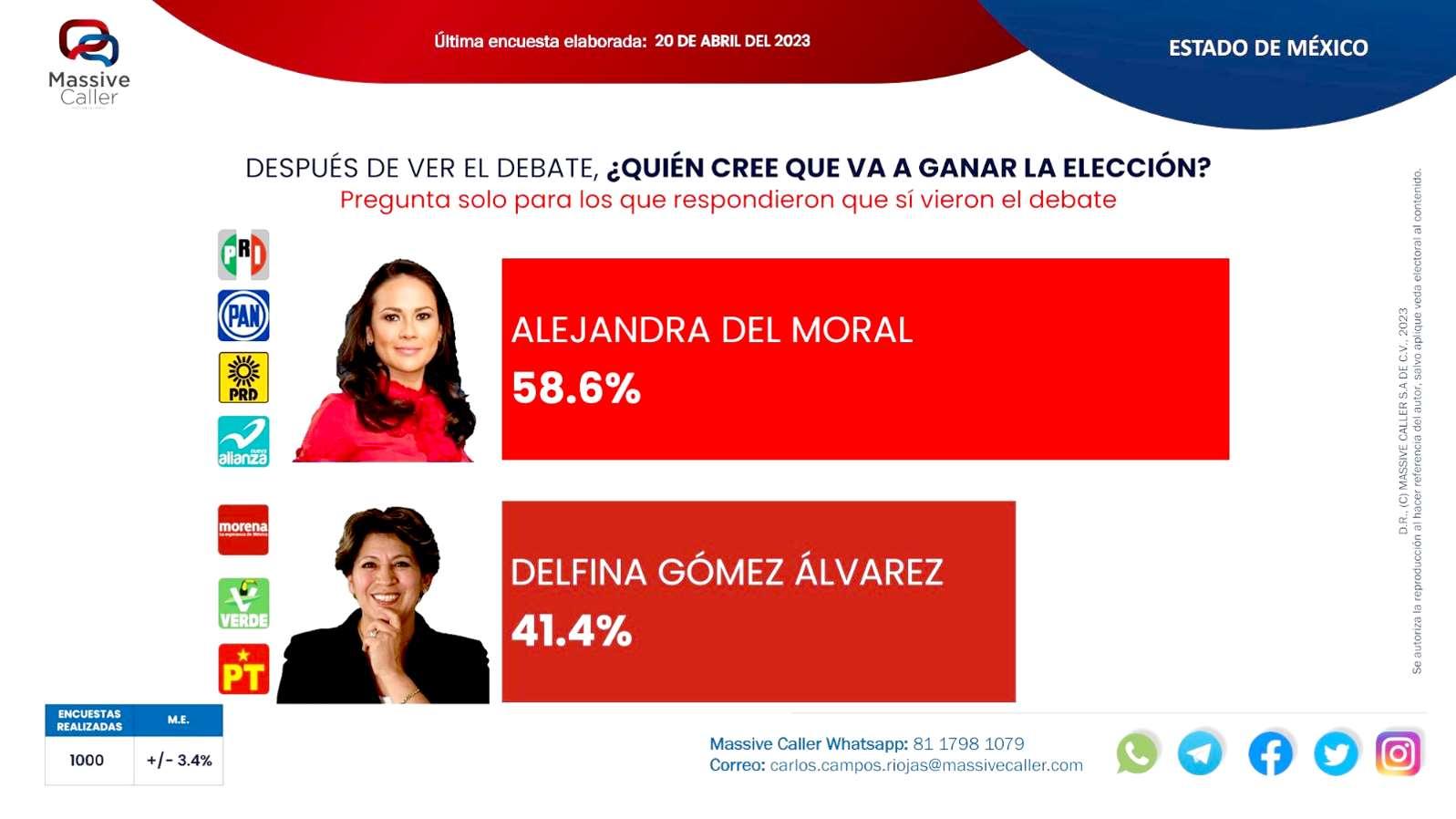 También se tocó el tema de las encuestas, donde Delfina Gómez comentó que, los ataques hacia su persona de Del Moral, eran resultado de "la desesperación" porir 20puntosabajo, perola abanderada priista aseguró que "las encuestas, no votan".
