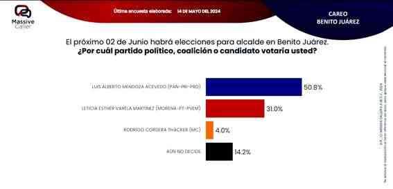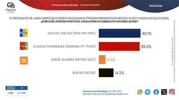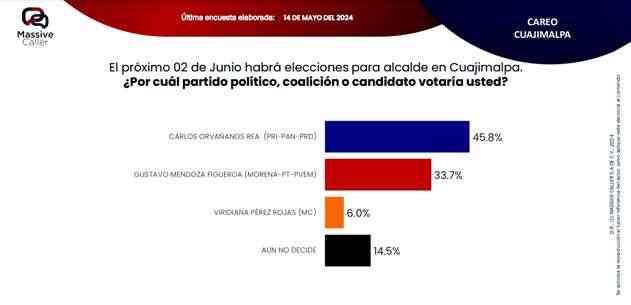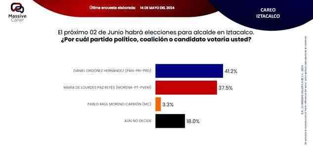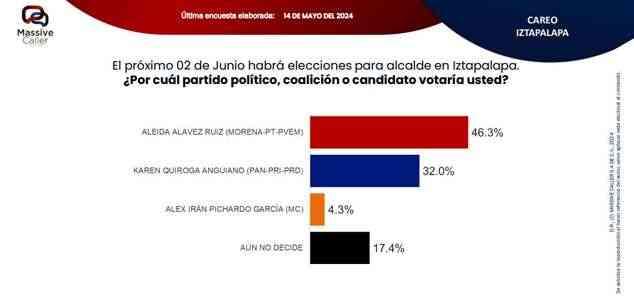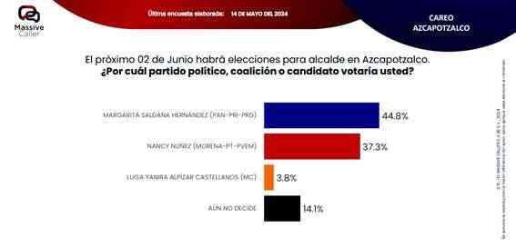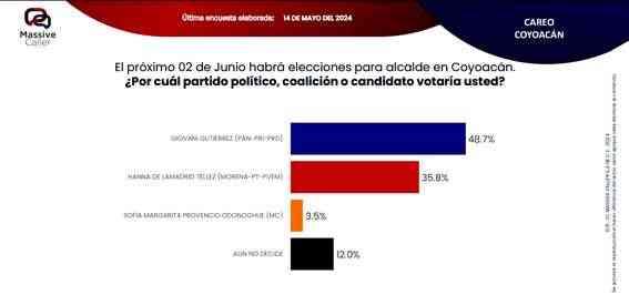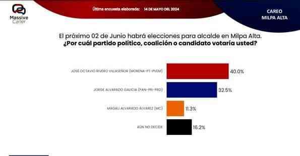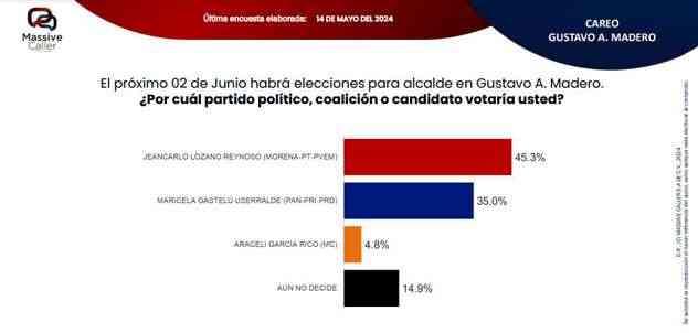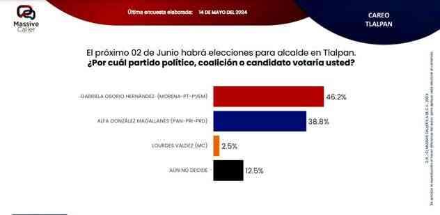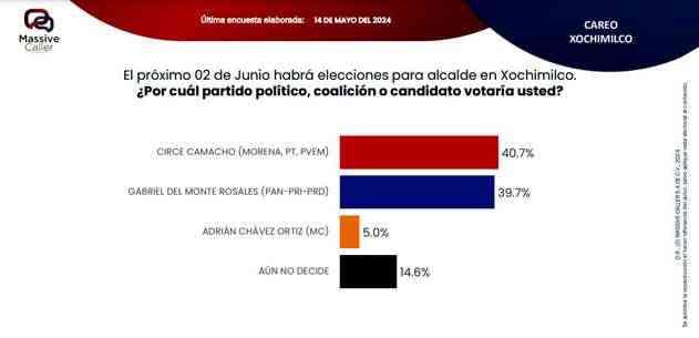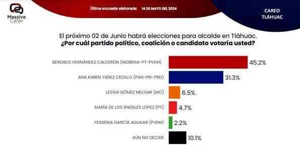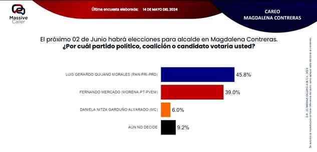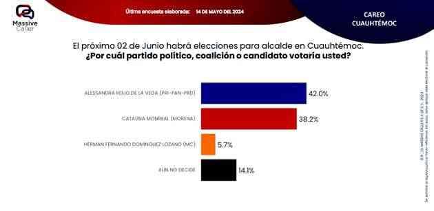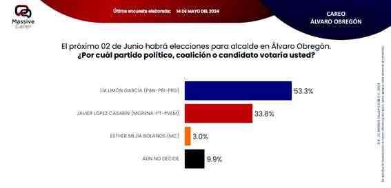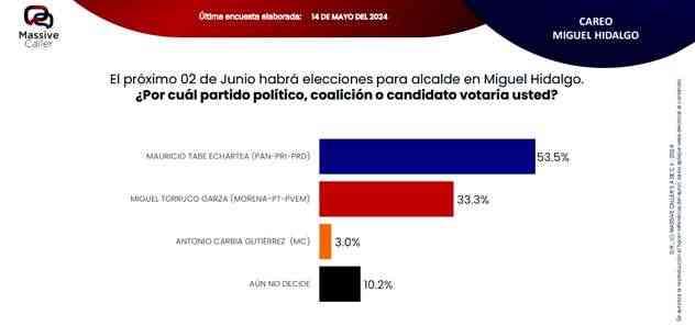 Según la última encuesta realizada por la empresa Massive Caller, la coalición "SigamosHaciendoHistoria",mantiene preferencia del electorado en siete alcaldías. Lo relevante de este ejercicio es que los candidatos de la oposición se ubican en el segundo lugar, pero muy cerca del primer lugar, por lo que no se descarta que el día de la elección se den algunas sorpresas.