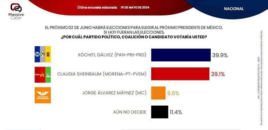 Asólo quince días de las elecciones que definirán quién gobernará al país en los próximos seis años, la encuestadora Massive Caller Massive Caller confirmó que la abanderada del PAN-PRI-PRD,XóchitlGálvezRuiz,aventajaconochodécimasdepuntoasuprincipaloponente,la morena Claudia Sheinbaum,pero que serán los votantes que se encuentran indecisos quienes, seguramente, habrán de inclinar la balanza para algunodelos lados,pues representan 11 por ciento del electorado, el que supera los 90 millones de votantes,la mayoría de ellos jóvenes, a quienes el risita y exsecretario de Turismo,Enrique de la Madrid, exhorta a sufragar por la candidata de la oposición,a menos quequieranparaellosylosniñosyniñasdelpaís un país mediocre, impreparado, con carencias económicas, sin oportunidades de acceso al empleo,la salud,la medicina y latecnología,que es lo que proponen los seguidores de quienes truenan contra aquellos que no se conforman con un par de zapatos y tampoco aceptan las absurdasimposicionesdelasmásaltasautoridades, las que, con hechos, acreditan que quieren para los mexicanos una nación dictatorial, en la que la ley no valga y los Poderes Judicial, Federaly Legislativo se sometan al Ejecutivo Merecemos un mejor país y en las manos de las nuevas y futuras generaciones está el lograrlo, por lo que el 2 de junio hay que votar por la mejor de las opciones y esa es, sin duda alguna, Xóchitl Gálvez, expuso el hijo del expresidente Miguel de la Madrid Hurtado, destacado integrante de la comitiva de la senadora hidalguense, quien el domingo, por su parte, encabezará la marcha de la llamada "marea rosa" "marea ,la que se concentrará en la explanada del Zócalo citadino en defensa de la República, acto en el que López Obrador ya autorizó el izamiento de la bandera monumental, la que ha
