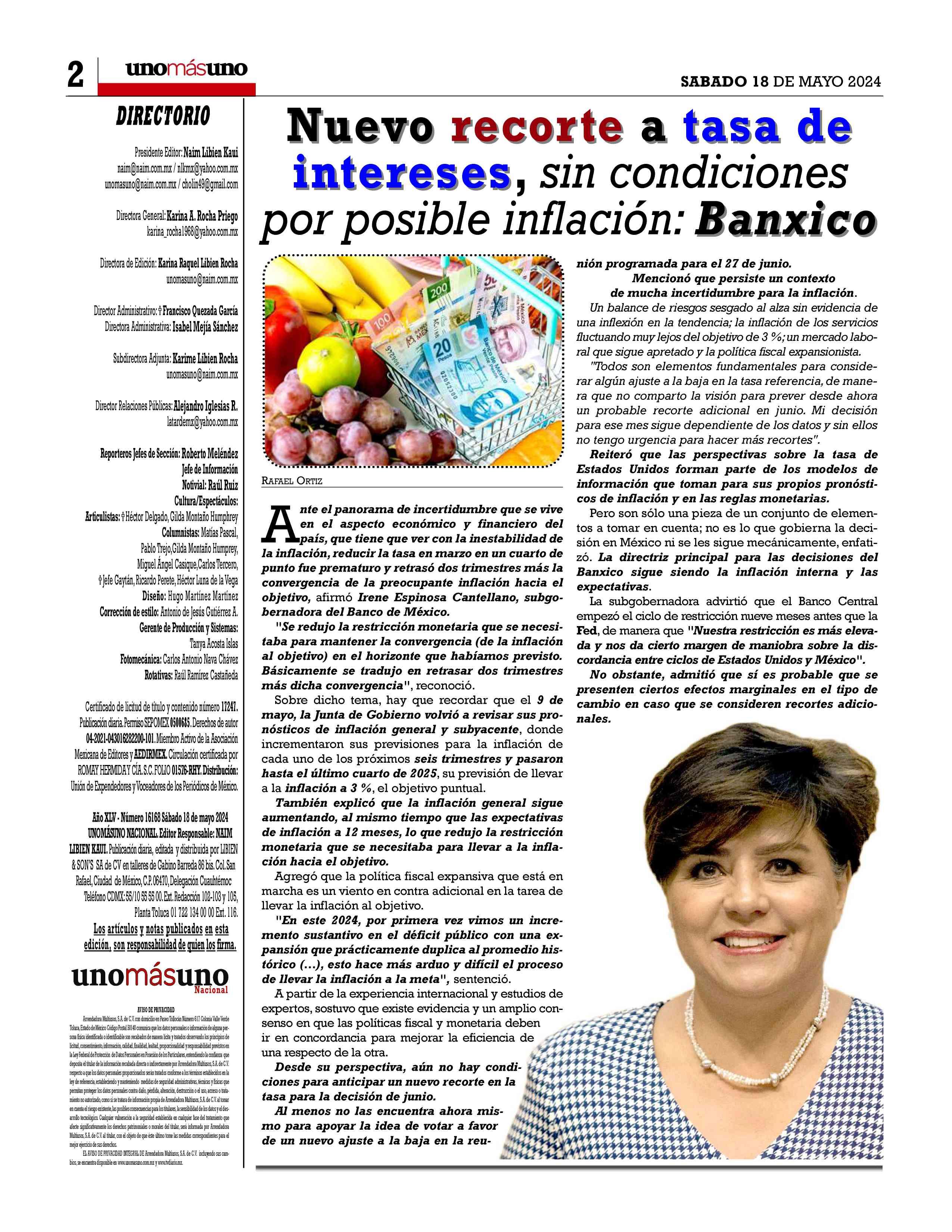 Pesos PresidenteEditor:Dr.NaimLibienKauiDirectoraGeneral:Dra.KarinaA.Rocha SÁBADO18DEMAYO2024 AñoXLIVNÚMERO16168 P.3 10
