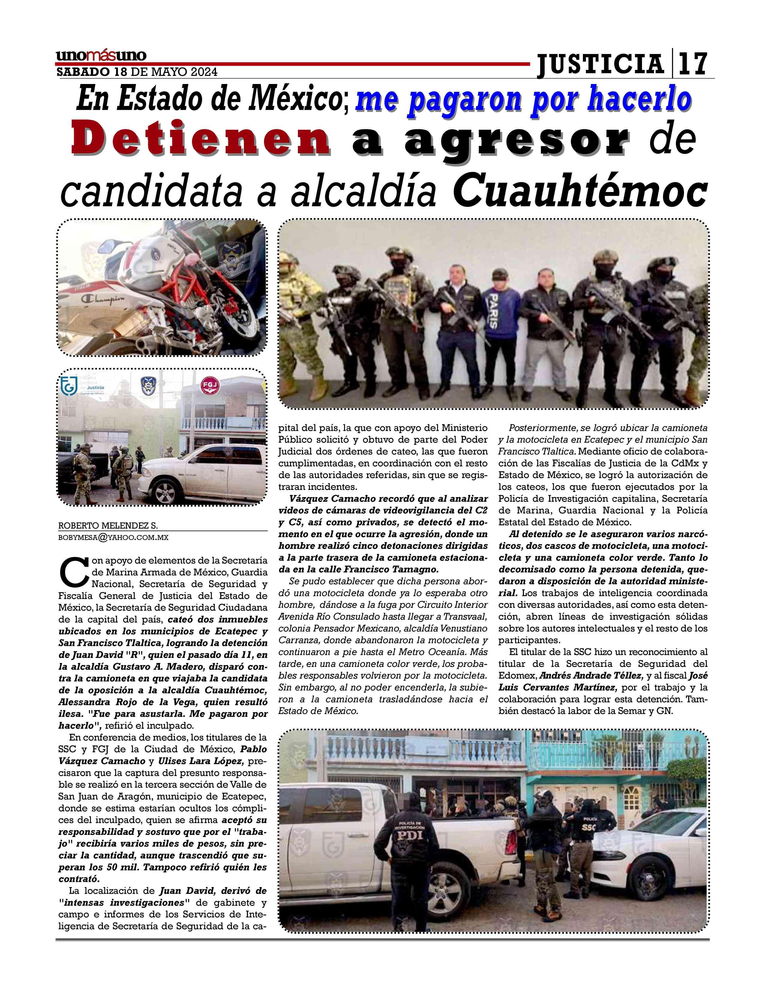 El presunto responsable aceptó que le pagarían sesenta mil pesos por el trabajo, el que tenía por objetivo dar un susto a la aspirante, quien de acuerdo con una encuesta aventaja, con mucho, a Catalina Monreal, quien a su vez afirma que lleva la delantera en la justa electoral de junio próximo, la que se ha visto empañada por la violencia contra los aspirantes a cargos de elección popular,entre ellos a alcaldías,quienes incluso han llegado a ser privados de la vida, al igual que algunos de sus allegados o parientes, lo que resulta verdaderamente trágico