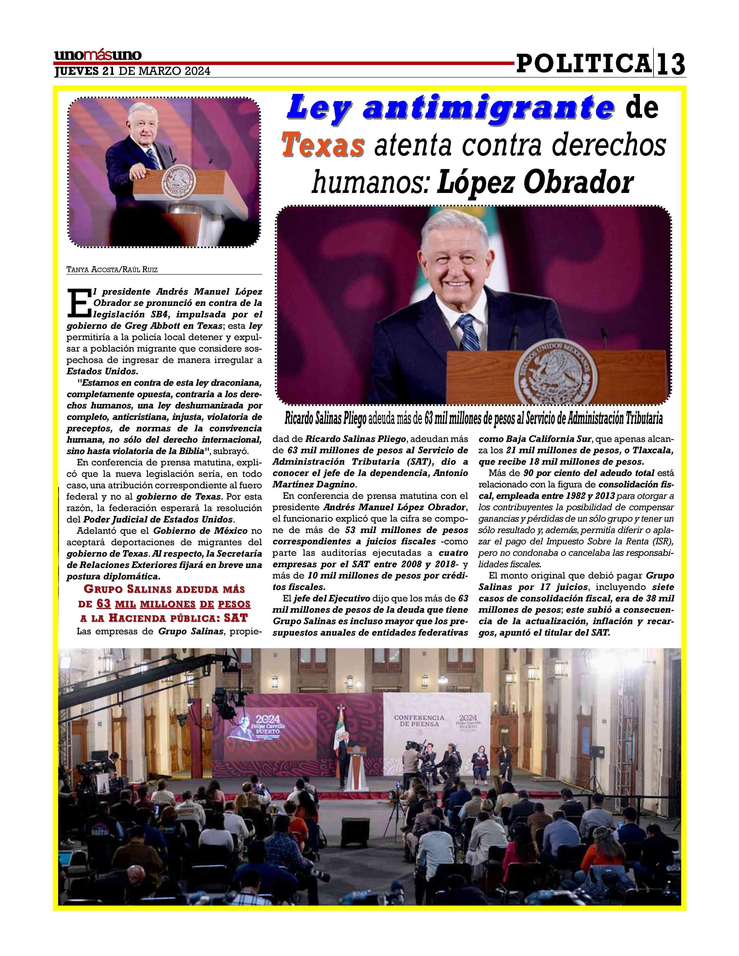 "Losadeudos por más de 53 mil millones de pesos,estos adeudos se encuentran en cuatro empresas en 17 juicios y todos fueron auditorías de 2008 a 2018. Todos estos adeudos se observaron por parte del Servicio deAdministración Tributaria por un monto de 38 mil millones de pesos, pero al día de hoy, con la actualización por la inflación y por los recargos, haciendo un monto de 53 mil millones. Durante la administración del presidente Andrés Manuel López Obrador el SAT ha emitido créditos fiscales por 10 mil millones de pesos, teniendo una deuda de 63 mil millones de pesos. Eso es lo que tenemos al día de hoy", explicó.